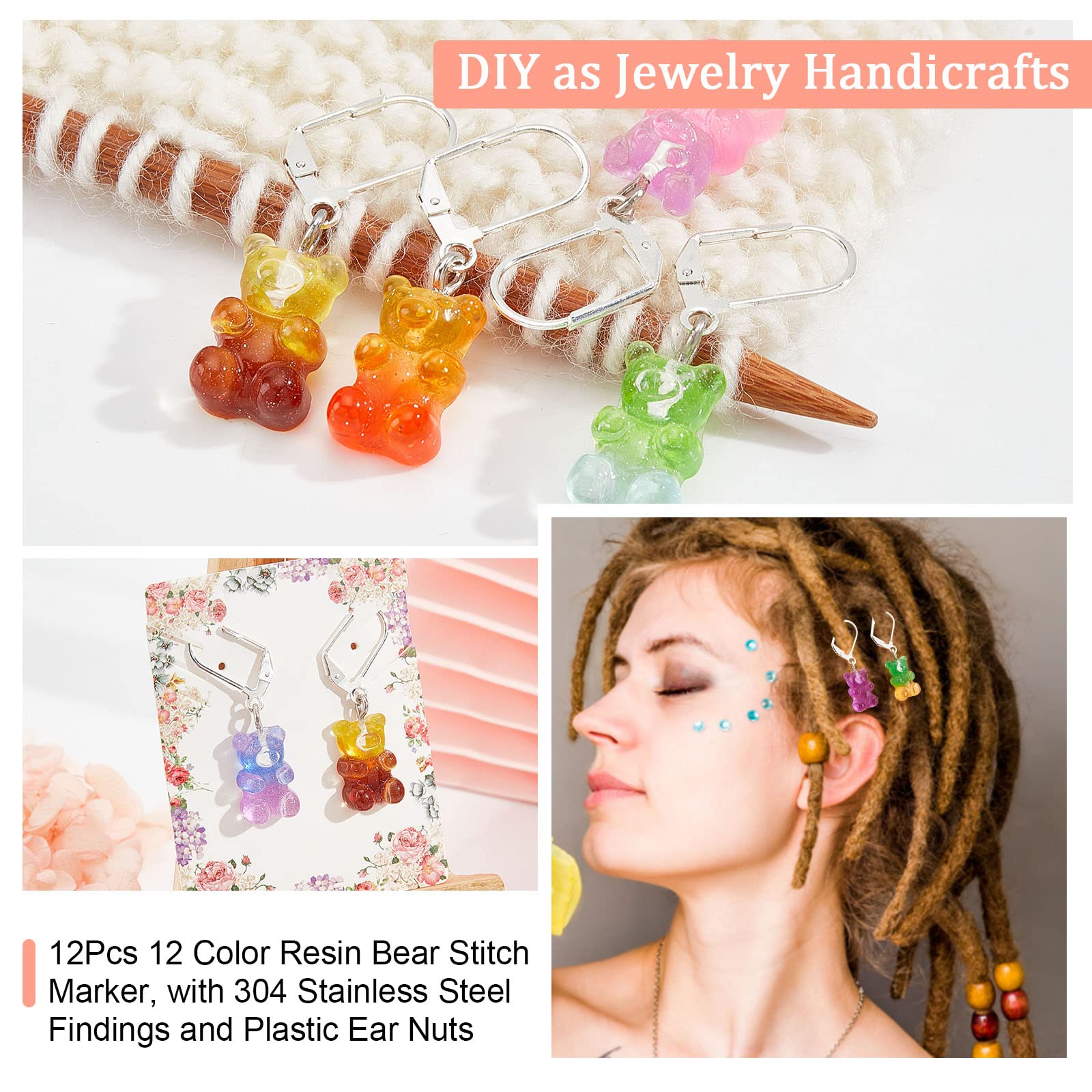 NBEADS 12 Pcs Bear Stitch Markers - 12 Colors Resin Gummy Bear Crochet Stitch Marker Charms - Locking DIY Handmade Gift for Knitting, Weaving, Sewing, Quilting, Handmade Jewelry
