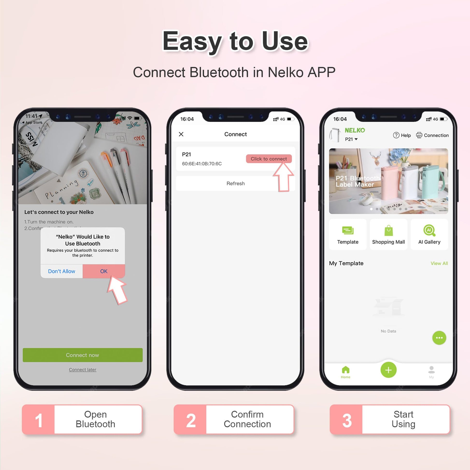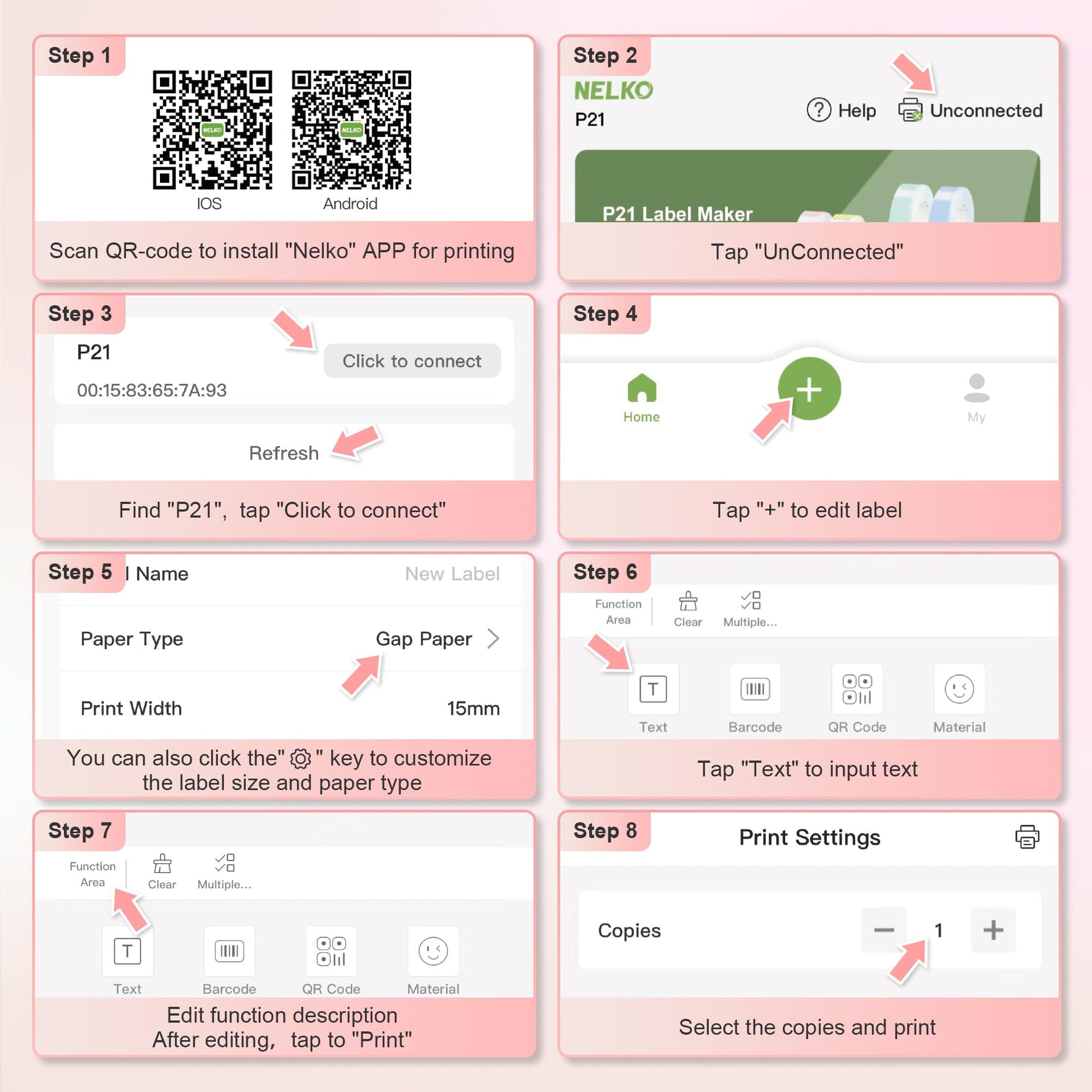 - ✅【Easy to Use】NELKO label printer compatible with IOS & Android Phone via bluetooth connection. Step 1: Download "Nelko" APP from Google Play or App Store. Step 2: Install the paper roll. Step 3: Connect the P21 bluetooth within APP. Step 4: Choose a quick template and start printing. It is not compatible with Google phones on Android 14. This label maker machine with tape APP included more than 90 +Fonts, 10+ Languages, 450+ Materials. (Note: This label maker doesn't work with computers)