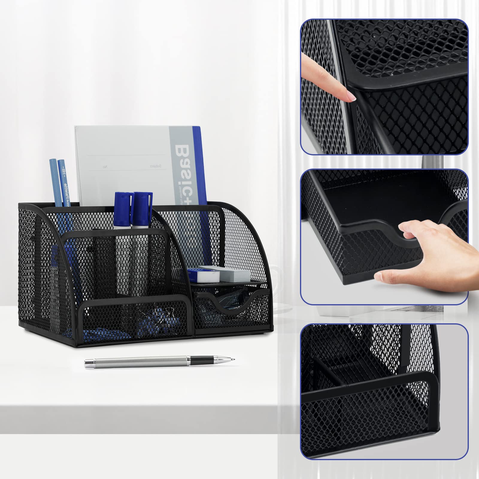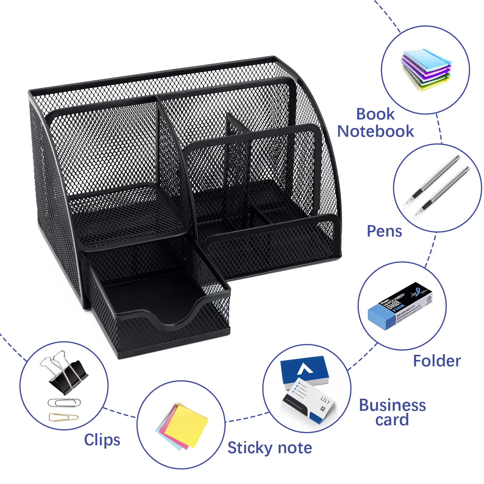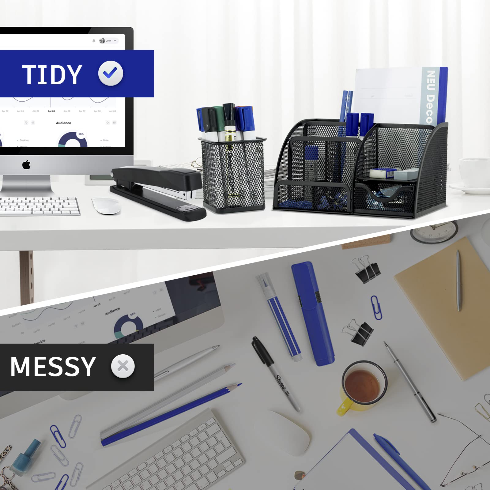 - 【Keep Your Desk Organized】: Neudeco Mesh Desk Organizers provide a sleek and functional way to store all your office supplies. With 6 compartments and a sliding drawer, it's perfect for storing pens, pencils, scissors, paper clips, and other small items that clutter your workspace