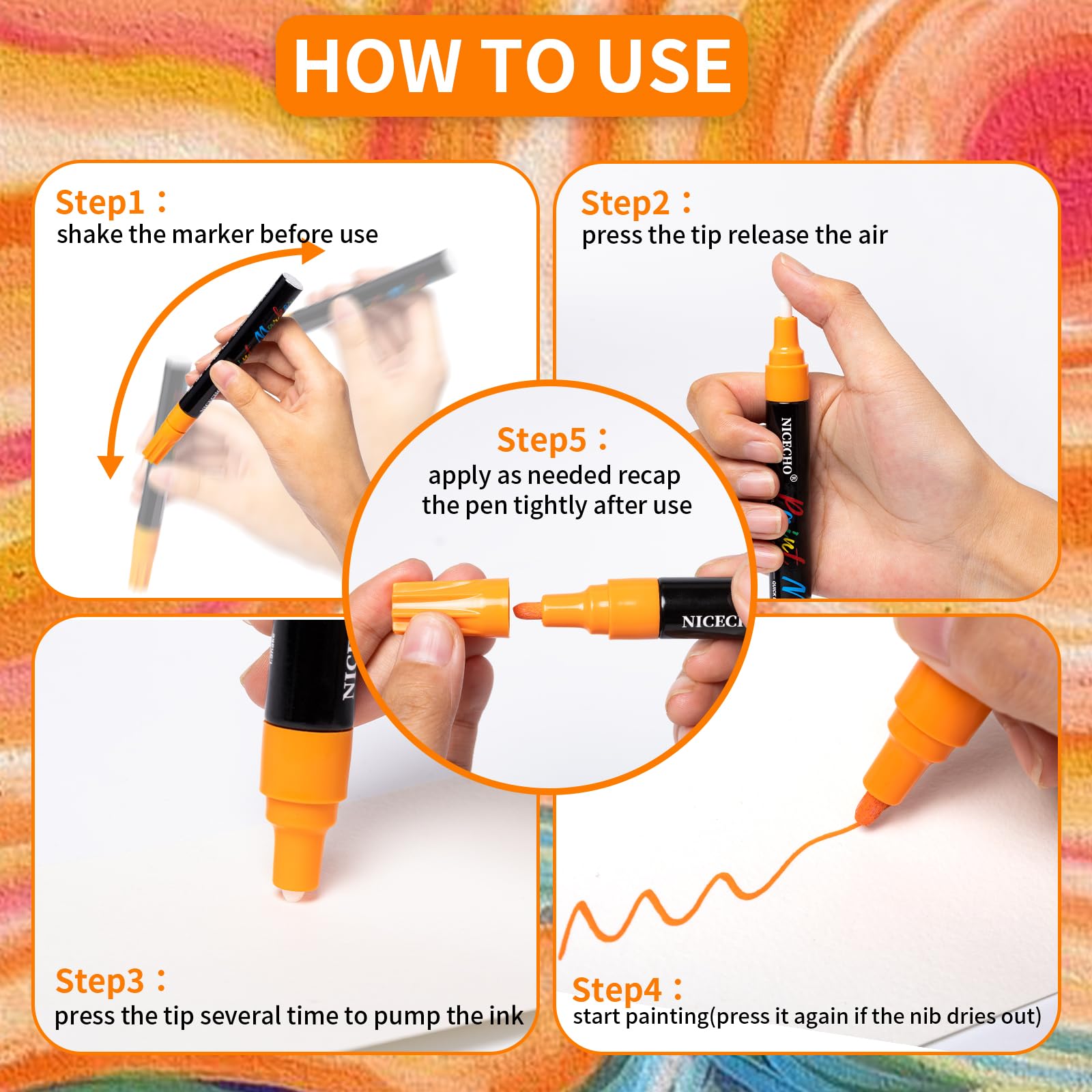 - VIBRANT COLORS: This complete set of Nicecho paint markers comes with 12 unique and vibrant color options to choose from (red, pink, orange, purple, green, blue, yellow, brown, black, silver, gold and white), rich primary and complementary colors with no duplicates, making it easy for you to choose exactly the right color every time. A variety of colors allows you to let your imagination run wild and have unlimited creative possibilities~
