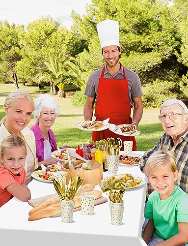 - đ°ăHigh Quality and Elegant DesignăOur party supplies pack features a White background and gold foil polka dot pattern, adding a touch of sophistication to your event. Made of 100% food-grade paper, our plates are sturdy and can hold heavy foods without bending or breaking. All party dinnerware are made of BPA-free, non-toxic, and tasteless plastic that is very strong and won't bend or break.