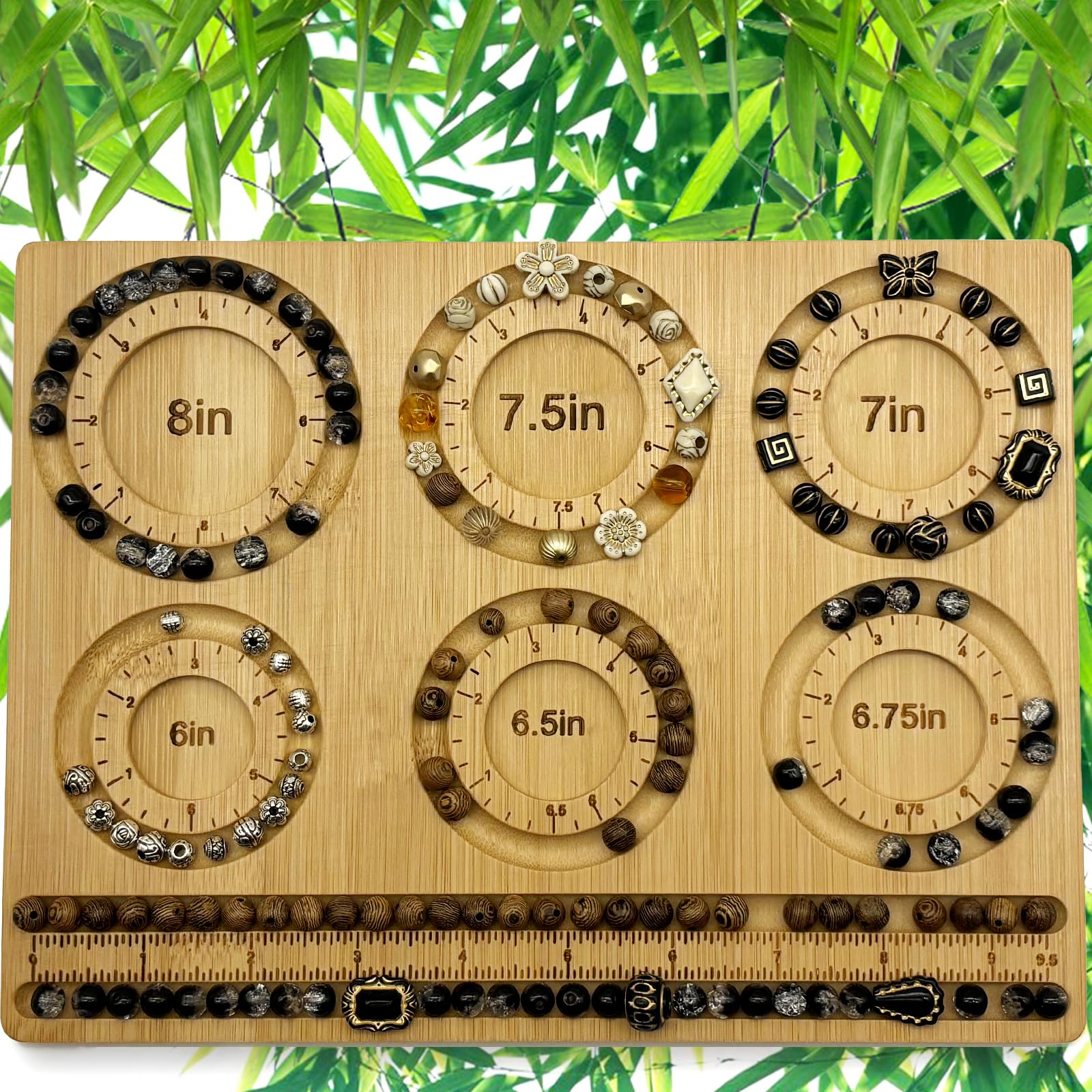 - đăMultifunctional Beading BoardăThe beading board bracelet for making includes 6 grooves specifically designed for making bracelets or ankles, ranging in size from 6 inches to 8 inches, to meet your needs for jewelry of different sizes., the bamboo bead tray has 2 straight slots with a length of 9.5 inches. Our bead design board has 6 storage slots, enough for you to use and make jewelry.