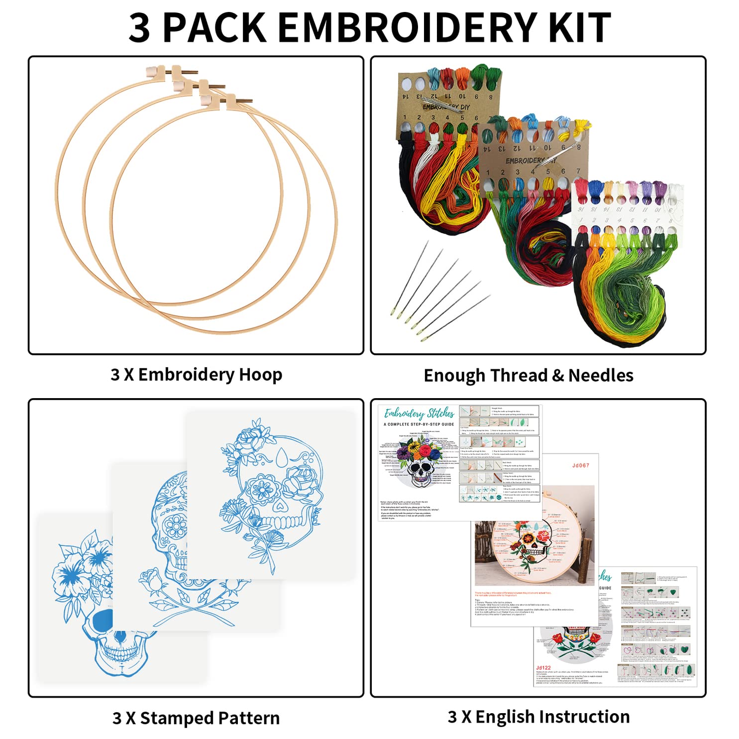 - 【Embroidery Sets】Funny embroidery kits contain 3 pack embroidery kits for adults, including 3 x adjustable embroidery hoops(7.8 inch/20cm), 3 x stamped cloth, 3 x English embroidery instructions, 6 x needles and enough flosses.