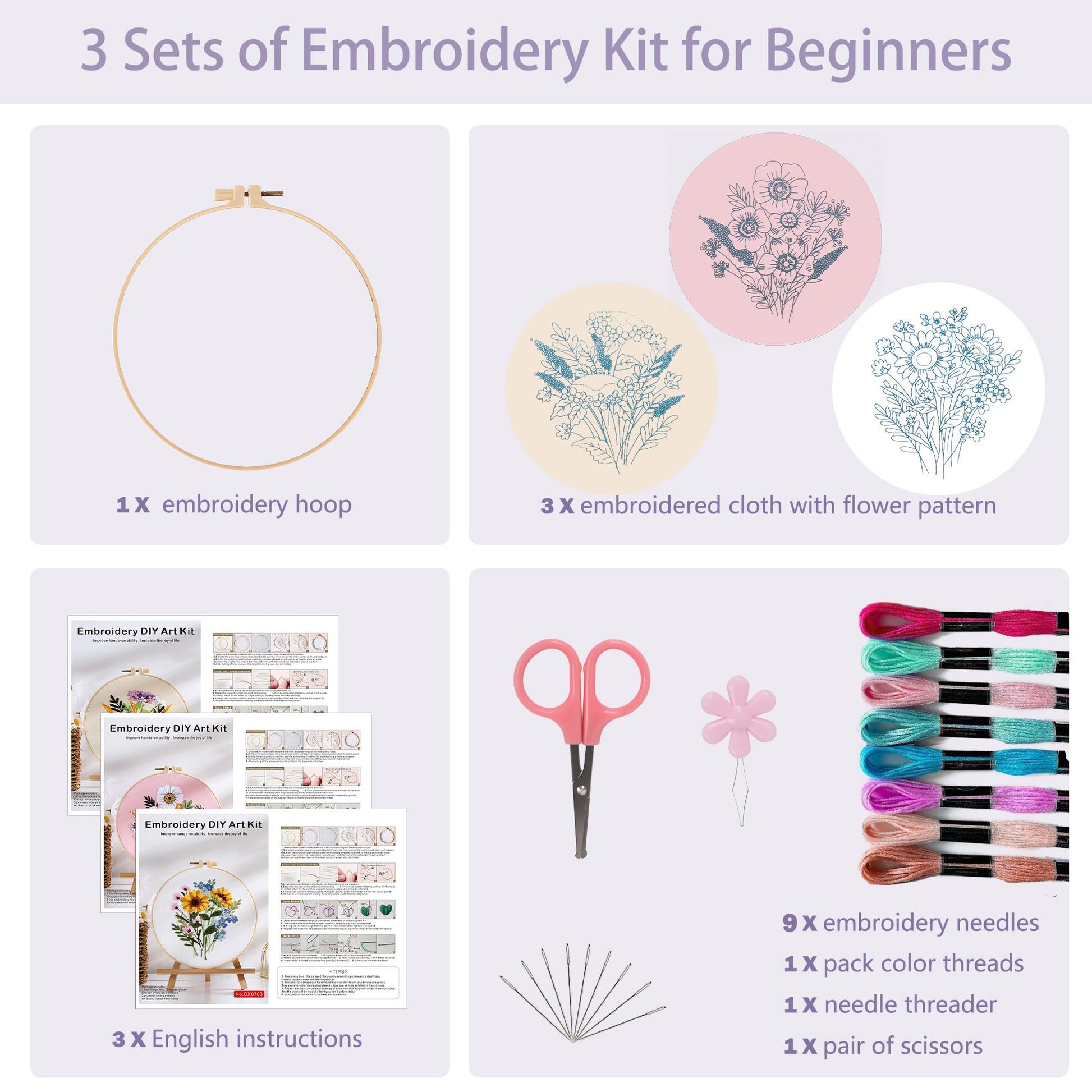 - 🌸 What's Included: Get everything you need in one set: 3 pieces of fabric with vibrant flower patterns, 1 embroidery hoops, a variety of vibrant color threads, 9 embroidery needles, easy-to-follow instructions, a pair of scissors, and 1 needle threader.