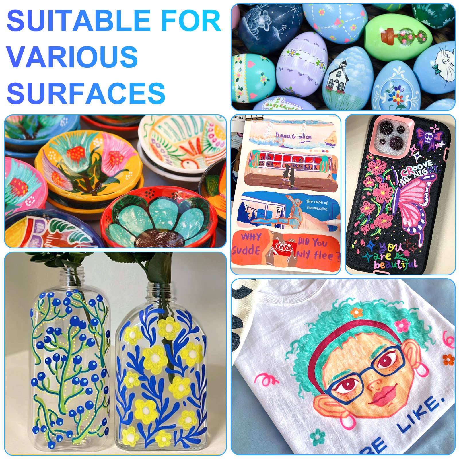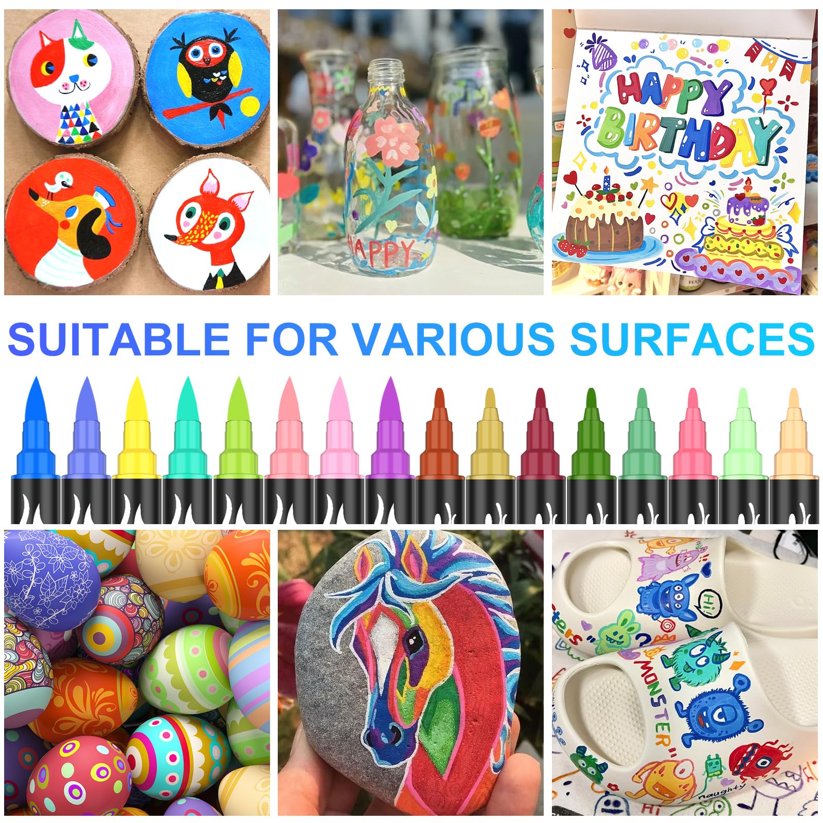 - 【SUITABLE FOR MUTIPLE SURFACES】 The fabric paint pens provides smooth inking for a variety of surfaces such as paper, metal, rock painting, wood, plastic, canvas, fabrics, ceramics, and more. High-quality opaque water-based ink with odorless and acid-free. The paint markers for wood can keep your artwork colors alive for a long time. Just express your imagination!