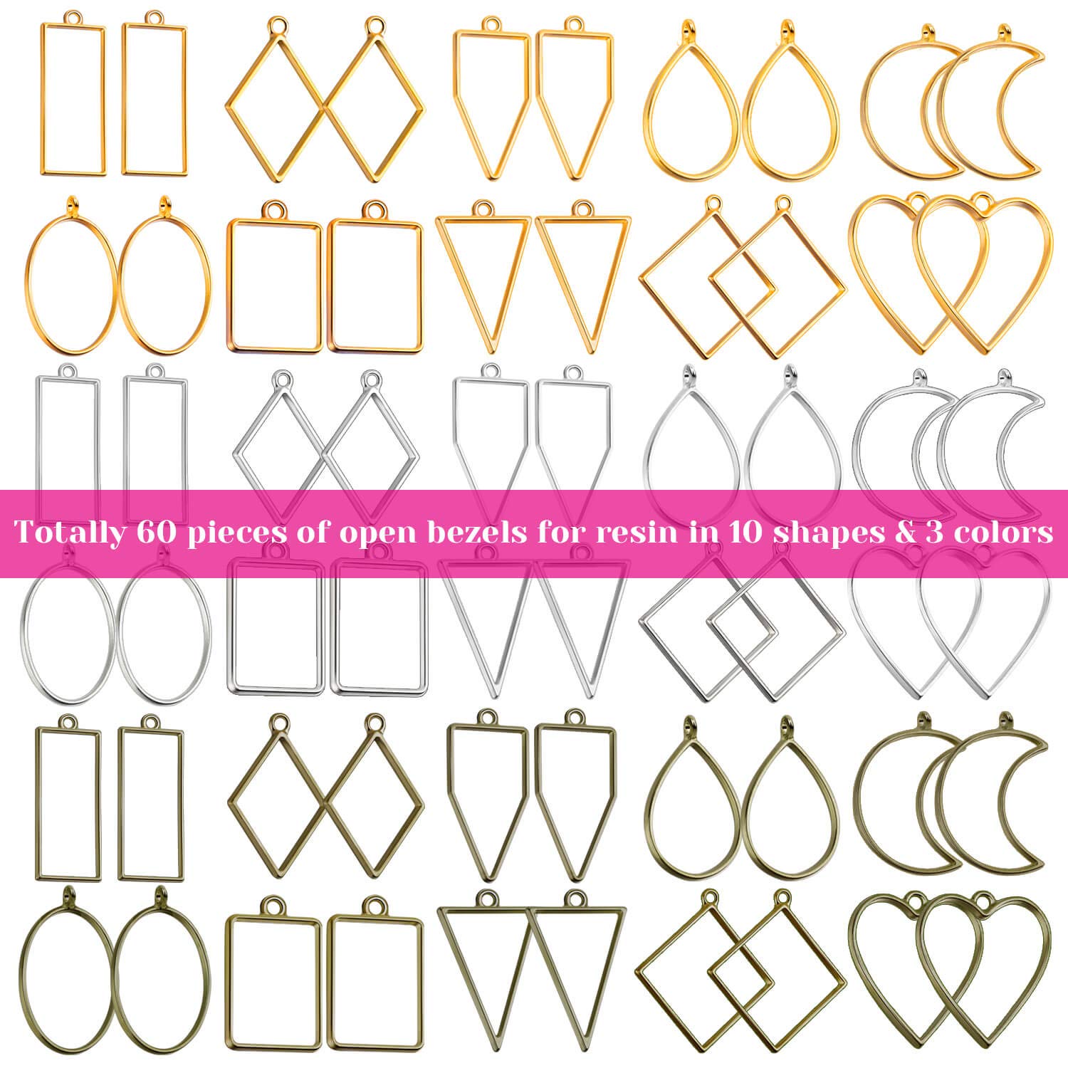 - Resin Jewelry Making Kit: Shynek metal jewelry resin molds kit comes with totally 60 pieces of bezels in 10 different geometric hollow shapes and 3 colors. Great resin kit for jewelry making