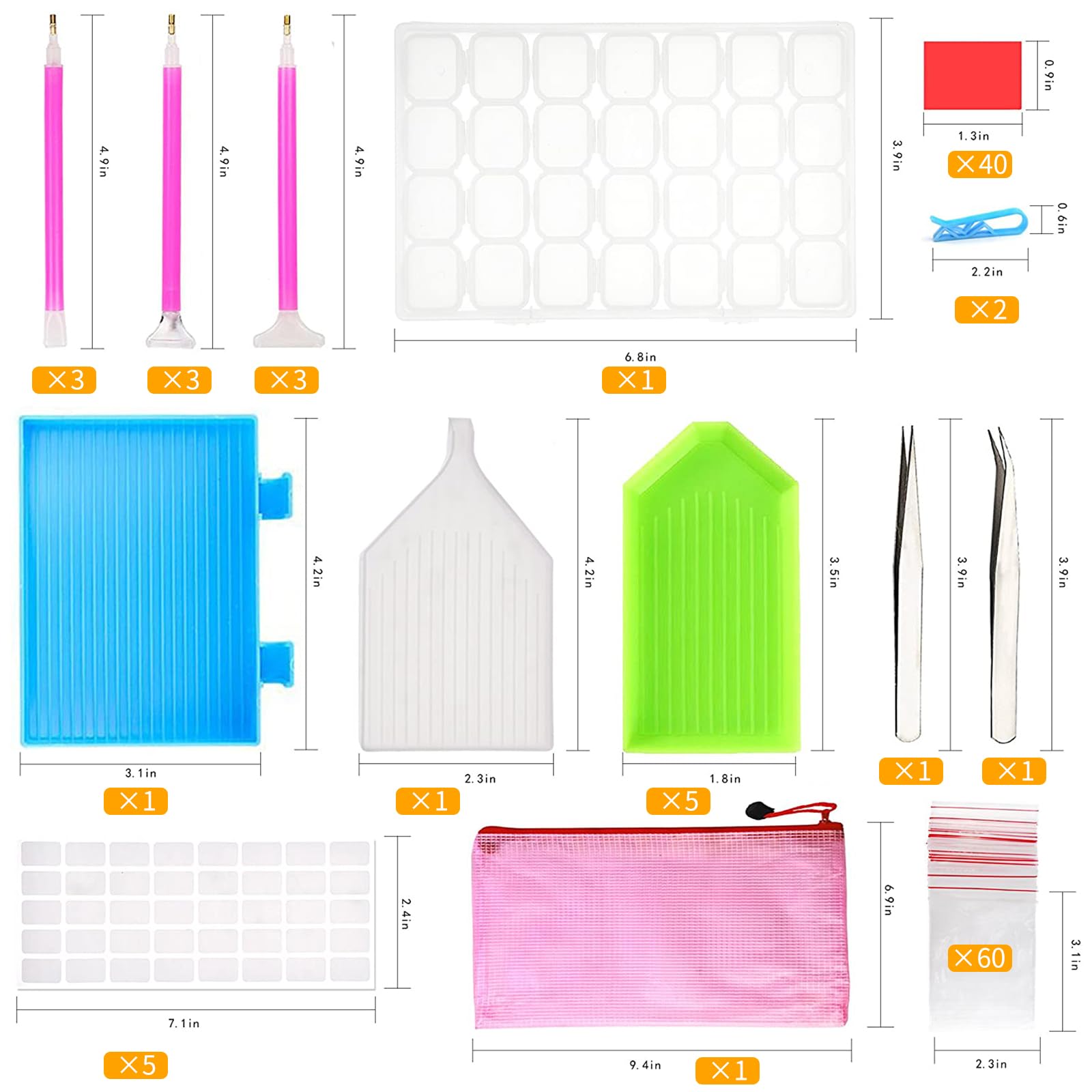 - Valuable Package: Includes 30 glue clay, 9 diamond stitch pens, 7 plastic diamond plates, 5 white marker sheets, 2 pairs of tweezers, 60 ziplock bags, 2 non-slip clips, 1 28-grid storage box, 1 zipper bag