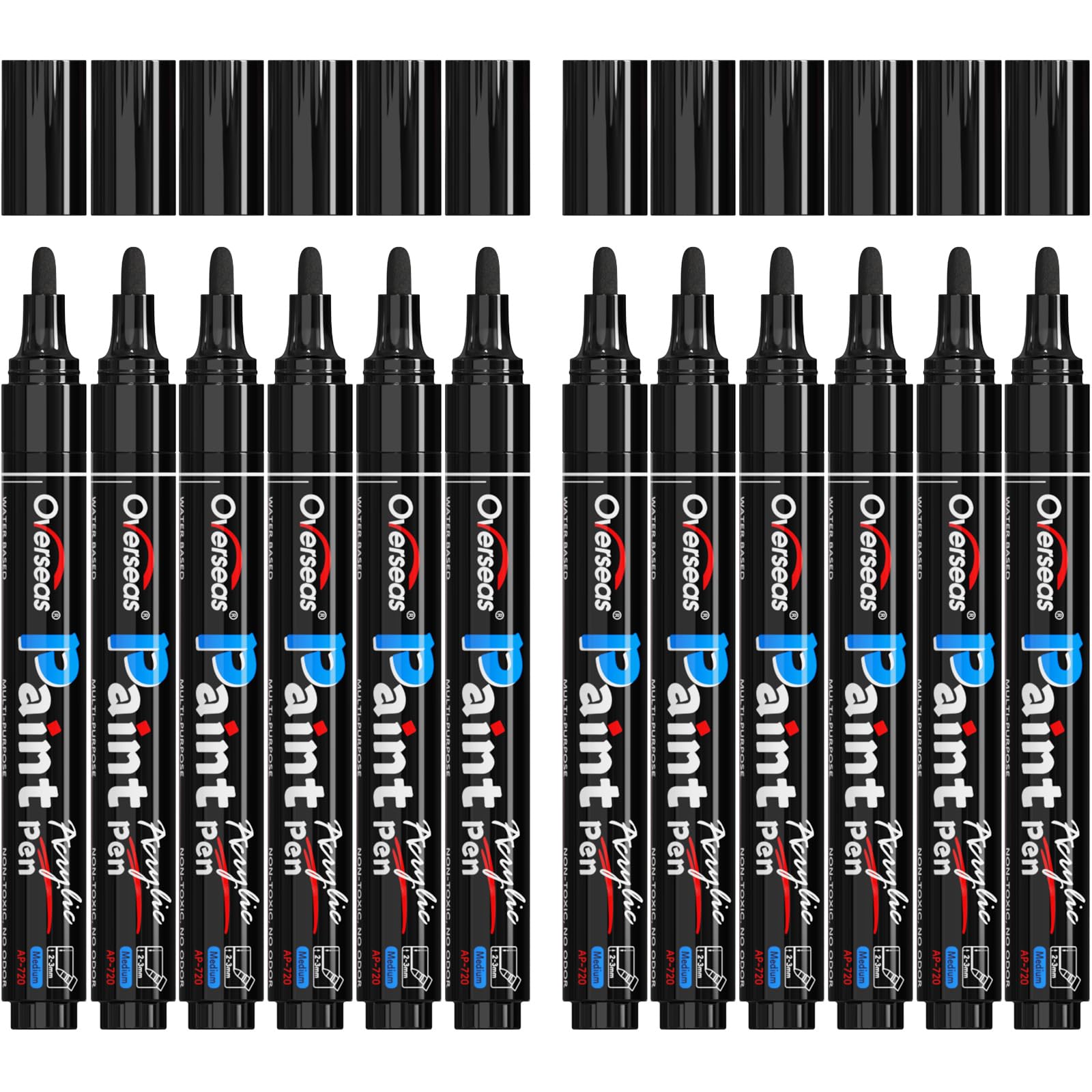 Overseas Black Paint Pens Paint Markers - Permanent Acrylic Markers 12 Pack, Water-Based, Quick Dry, Waterproof Paint Marker Pen for Rock, Wood, Plastic, Metal, Canvas, Glass, Fabric, Mugs. Medium Tip