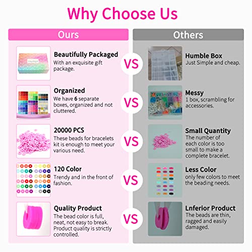 - EVERYTHING YOU NEED INCLUDE, WELL ORGANIZED IN 6 BOXES - The Clay beads bracelet making kit contains 19,000pcs clay beads in 120 different colors and 1000+ accessories. The rich accessories include letter beads, heart beads, evil eyes beads, smile face beads, square beads, star beads, pendants and charms, lobster clasps, etc. More than ten kinds of accessories to make your design more exciting. (Everything shown on the picture contains)