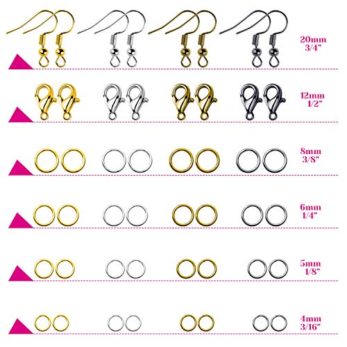 Details: PAXCOO necklace repair kit comes with totally 3200 pieces jump rings, earring hooks and clasps for jewelry making in assorted sizes and colors, provide you a nice selection and will last you a long time. Jump Rings: Material: lead-free metal Color: silver, gold, bronze & gunmetal black Style: close jump ring Size: 4 mm, 5 mm, 6 mm, 8 mm Quantity: 3000 pieces Lobster Clasp: Material: lead-free metal Color: silver, gold, bronze & gunmetal black Size: 12*6 mm Quantity: 120 pieces Earring Hooks: Material: lead-free metal Color: silver, gold, bronze & gunmetal black Size: 20 mm Quantity: 80 pieces Package Includes: - 1200 pieces 4 mm jump rings in 4 colors - 800 pieces 5 mm jump rings in 4 colors - 600 pieces 6 mm jump rings in 4 colors - 400 pieces 8 mm jump rings in 4 colors - 120 pieces lobster clasps in 4 colors - 80 pieces earring hooks in 4 colors