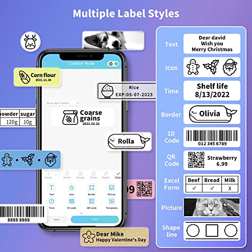 - Multiple Creative Function & Convenient Label Templates - Choose from a wide variety of pre-designed templates including 1000+ symbols, 60+ frames, and a variety of fonts, Convenience and saving time. Easy to create various design label stickers from App with Icon, texts, tables, symbols, logos, barcodes, QR codes, images, time, insert Excel, Scan, Ocr, and Voice RECG, it is fun and effortlessly