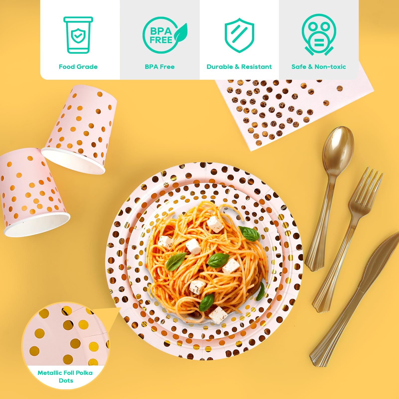 - 🎄🎄EXQUISITE AND ELEGANT DESIGN - Designed with a pink background and gold foil dot pattern, pink party supplies really add dimension to your parties. Gold plastic forks knives spoons adding an elegant, modern touch to any party. Perfect choice for a pink and golden-themed party