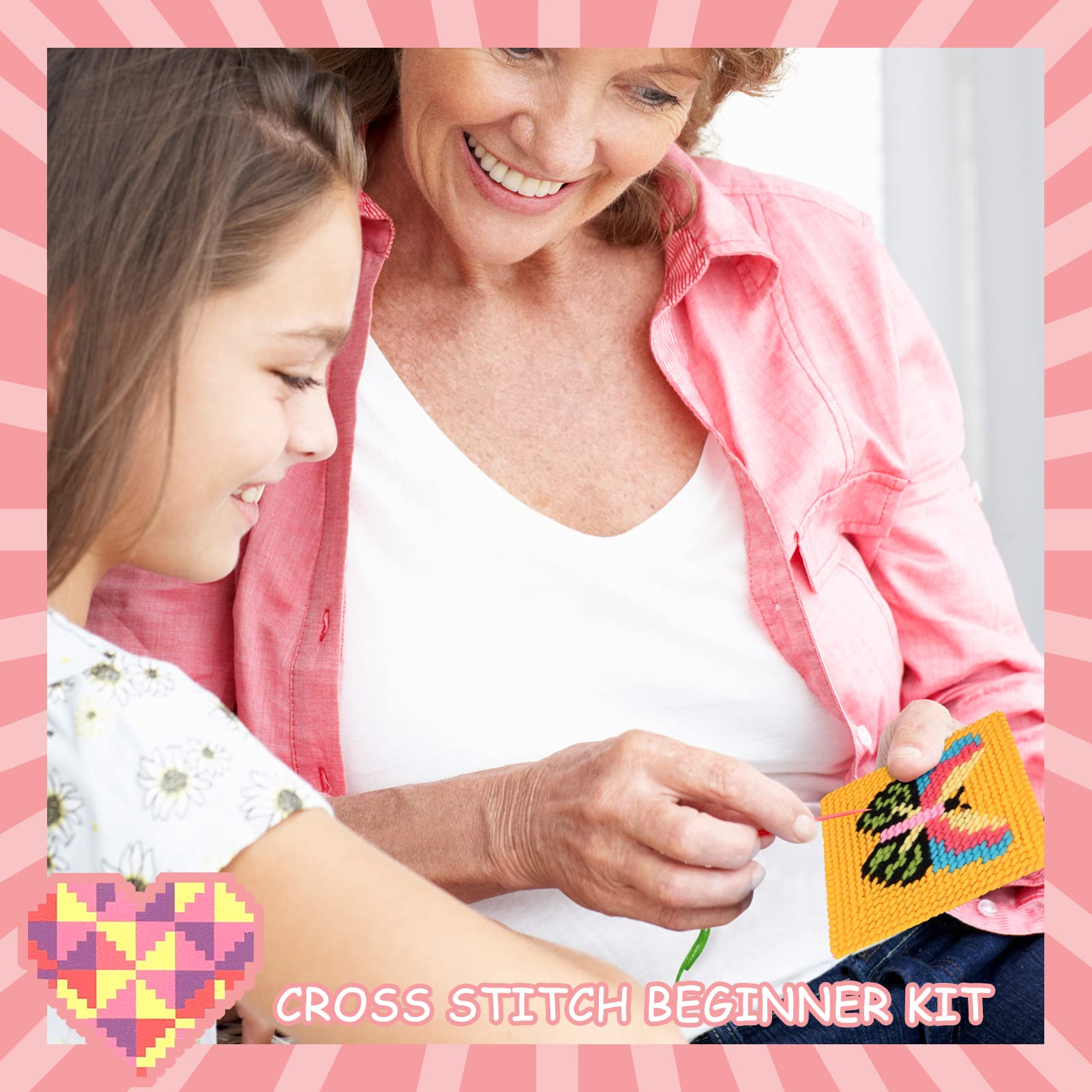 Pllieay Kids 10-in-1 Cross Stitch Beginner Kit for Kids, includes Instruction of 10 Different Patterns, 10 Blank Plastic Canvas for Needlework, and 14 Colored Threads, Needlepoint Starter Sewing Set