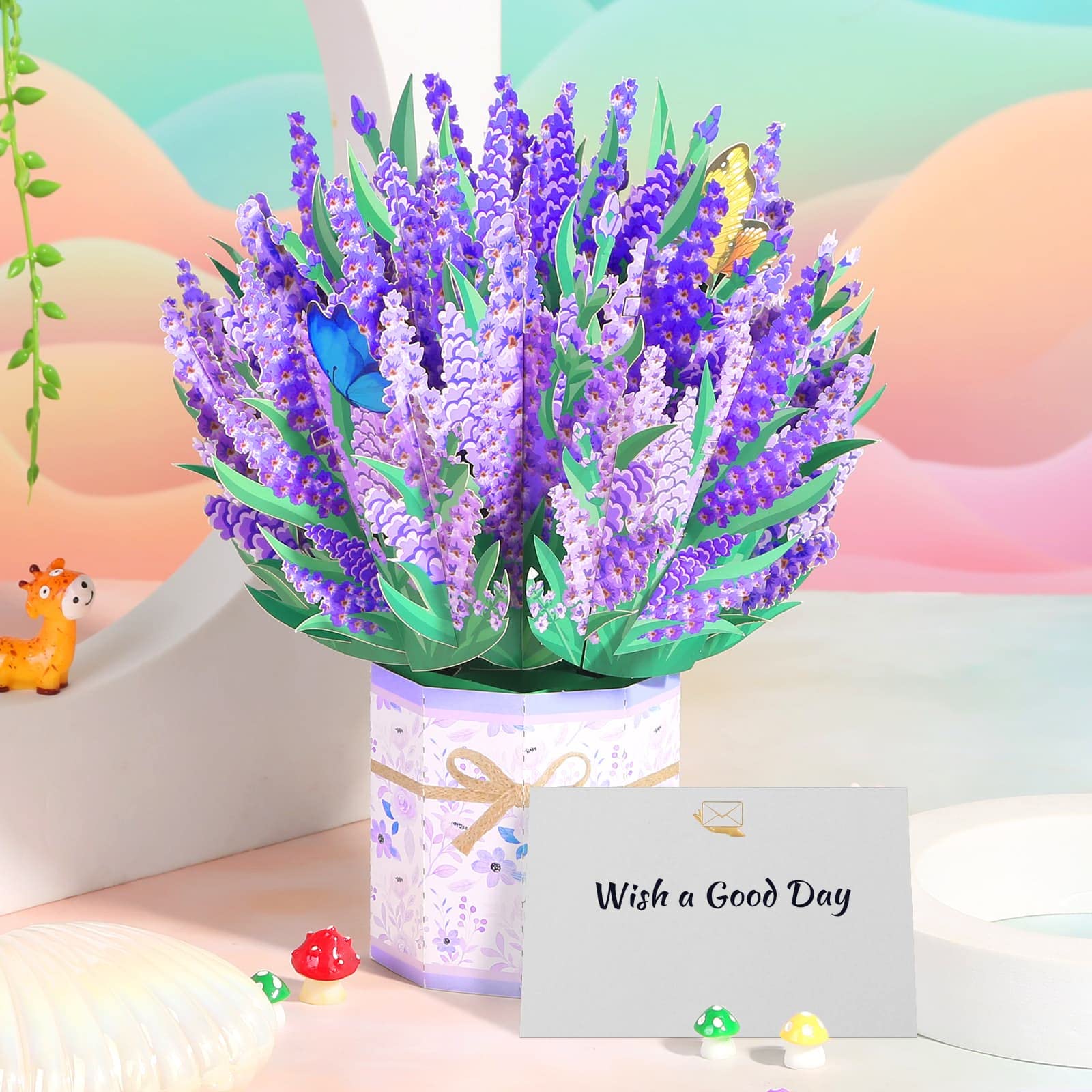 - Pop Up Flower Bouquet Cards: Lavender bouquet card flowers will create a special heartwarming moment. In the 3D lavender flower design, a bunch of flowers will appear when the card opens, which will surprise and delight the recipient. Beautiful paper flower bouquets create a long lasting, colorful keepsake.