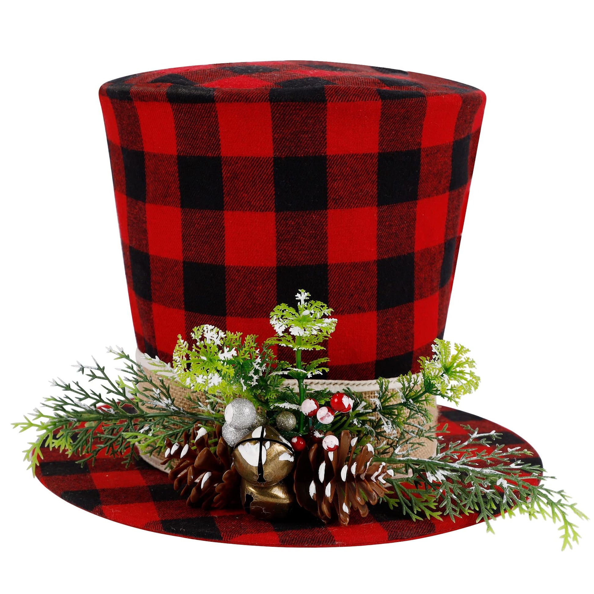 Prsildan Christmas Plaid Top Hat Tree Topper with Pine Cones, Berries, and Bells - Holiday Decor