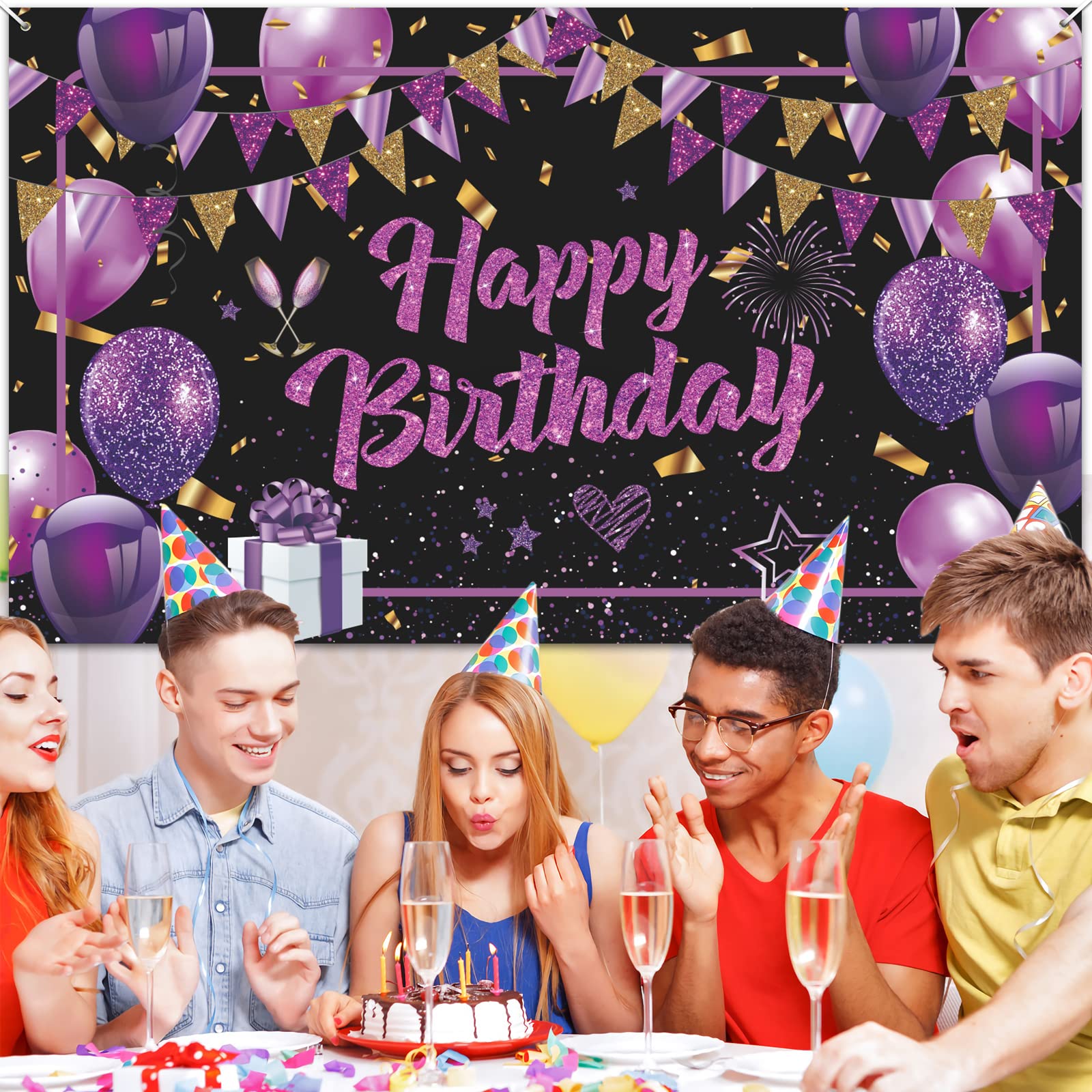 Purple Happy Birthday Banner Purple Black Gold Birthday Party Decorations Large Purple Birthday Sign Shiny Purple Black Birthday Backdrop Photo Booth Background for Women Girls 71 x 44Inch