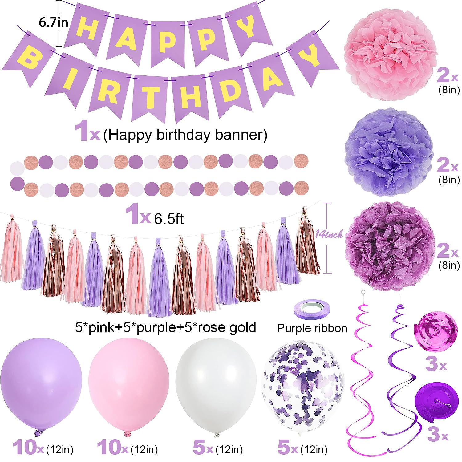 - 💗 【Purple Birthday Decorations Set Includes】You will get a valuable package of "HAPPY BIRTHDAY" bannner,3x pink swirls,3x purple swirls,6x paper pompoms in(pink,purple and light purple),1 set Paper Circle Dot Garland(6.5ft),15x paper tassels party garland,10x purple latex balloons(12inch) ,10x pink latex balloons(12inch),5x white latex balloons(12inch),5x purple confetti balloons(12inch),1 x ribbons,everything you need in one kit.