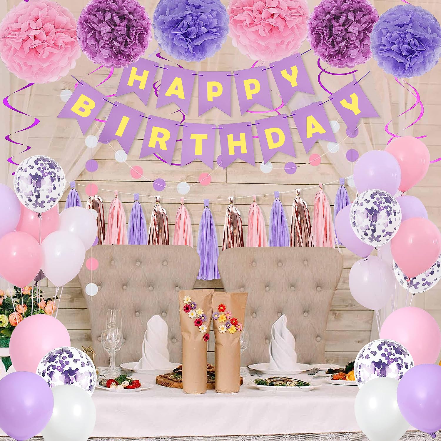 Purple Pink Birthday Party Decorations for Women Girls with Happy Birthday Banner,Hanging Swirls,Tissue Paper Pompoms,Circle Dots Garland,Tassel Garland Purple Birthday Balloons (Purple)