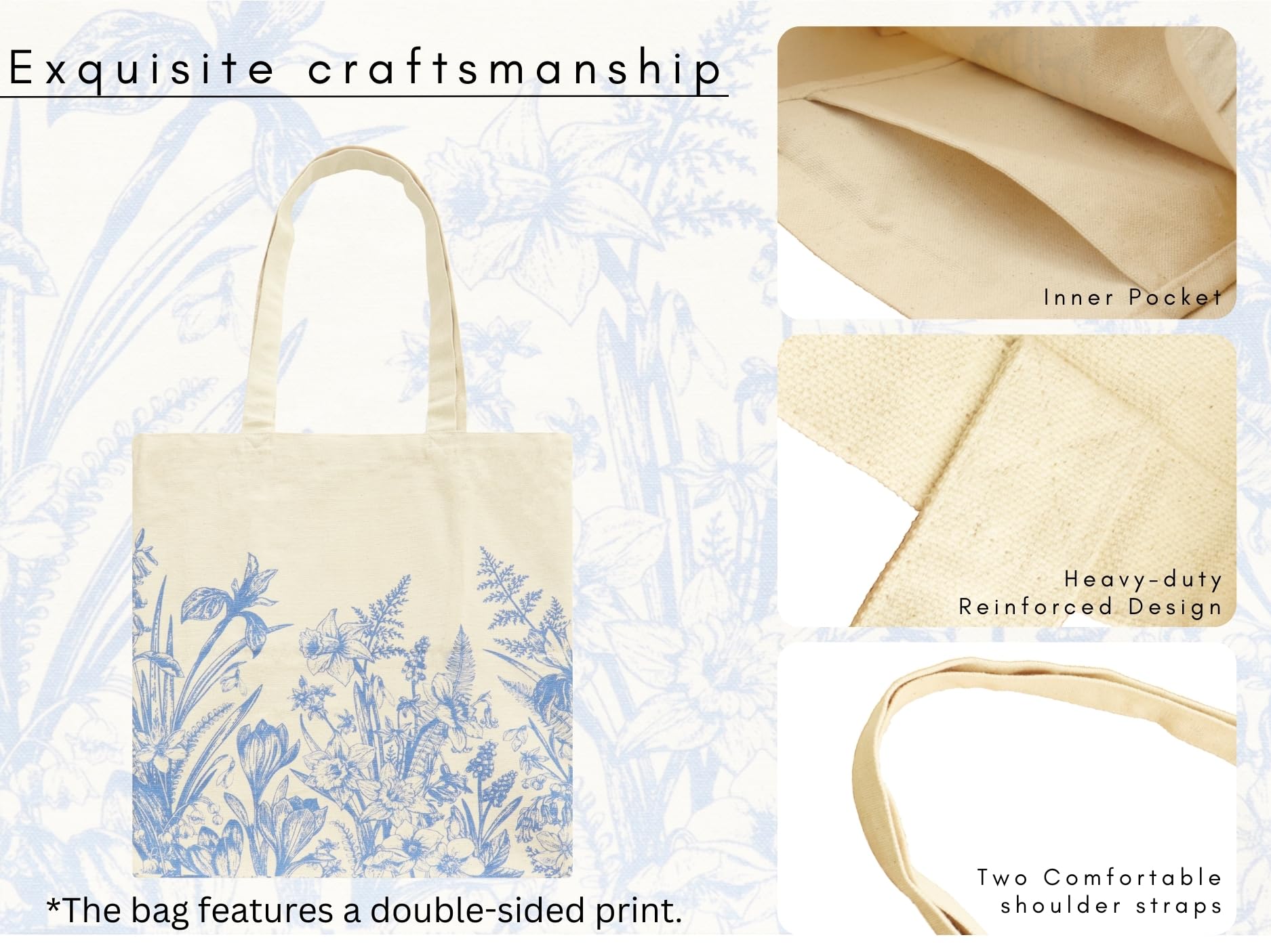 PurpleEssences Floral Tote Bag for Women, Cute Aesthetic Spring Tote Bag with Inner Pocket, Reusable Cloth Cotton Flower Tote Bag for Daily Essentials - Floral