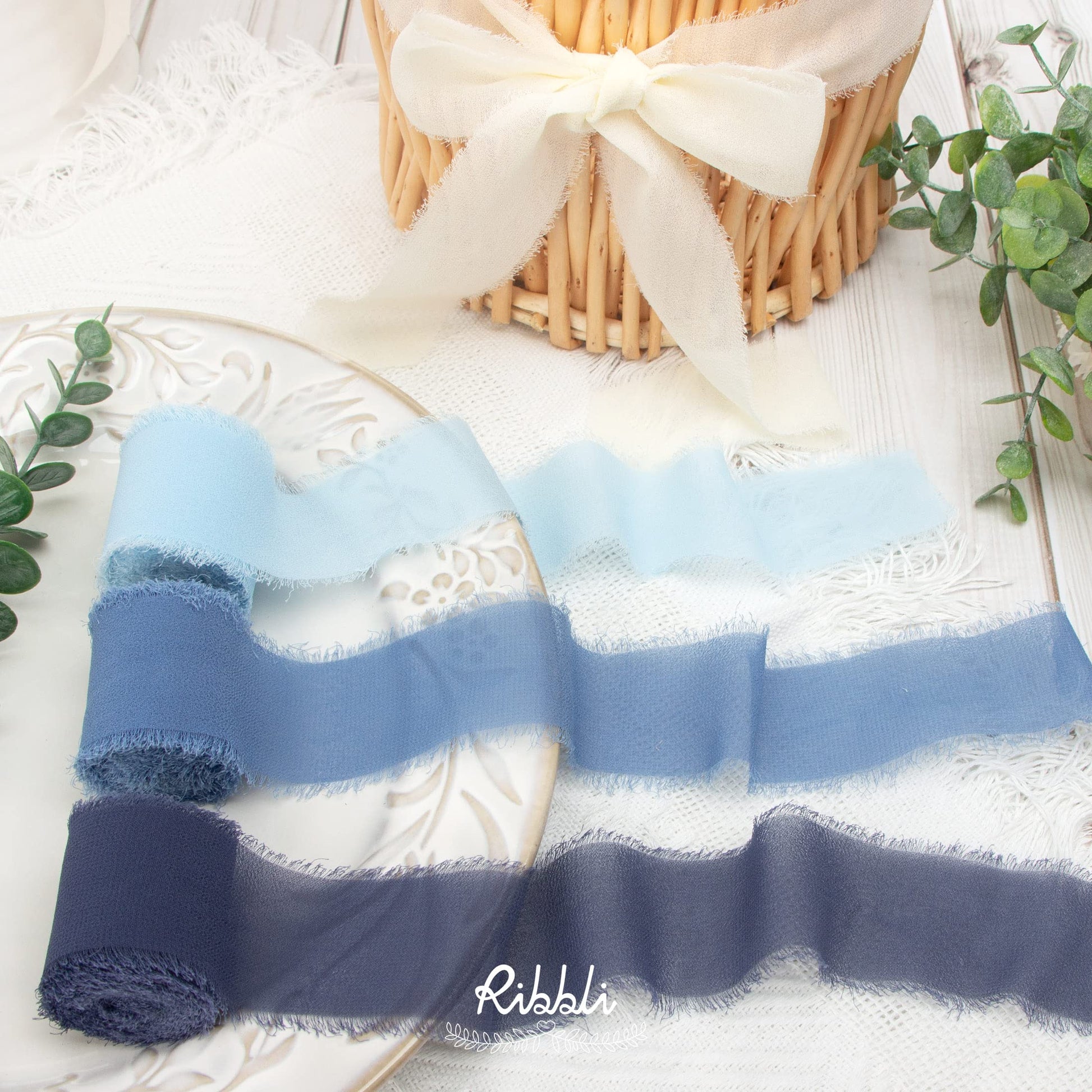 4 Rolls Dusty Blue Chiffon Ribbon Set,Handmade Fringe Silk Ribbon Gauze,1.5 in x 5Yd Each,Ivory/Pastel Blue/Dusty Blue/Dark Blue Ribbon for Wedding Invitations, Bridal Bouquets Wrapping