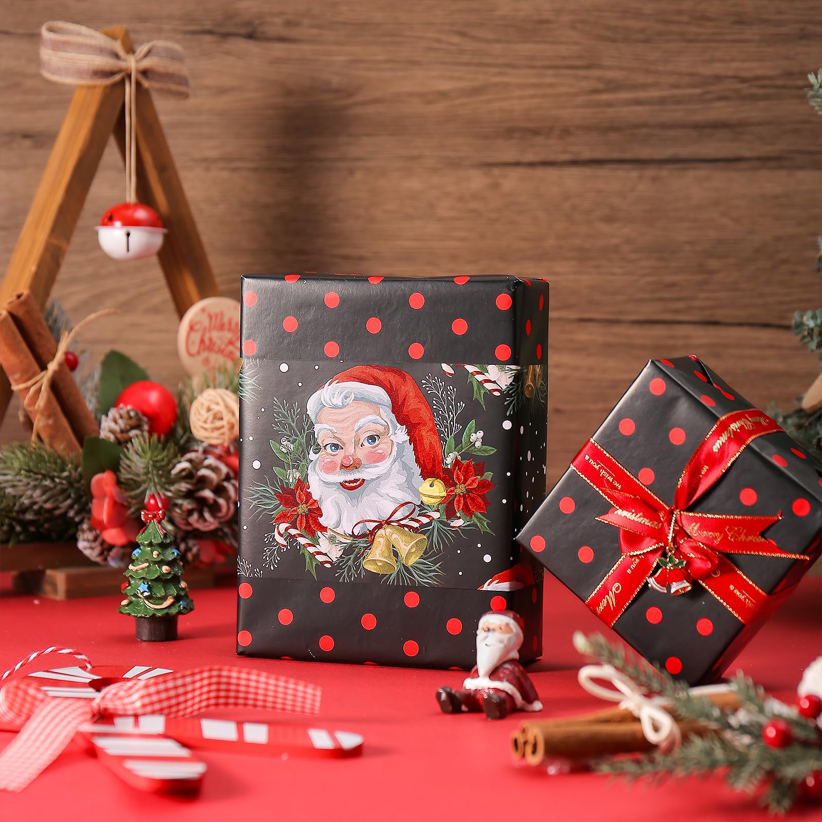 - Reversible Christmas Design: Enjoy two festive looks in one roll, one side features a vintage santa claus with poinsettias and falling snowflake on a classic black background, while the reverse side boasts a stylish red polka dot pattern, offering versatile options for your holiday gift wrapping