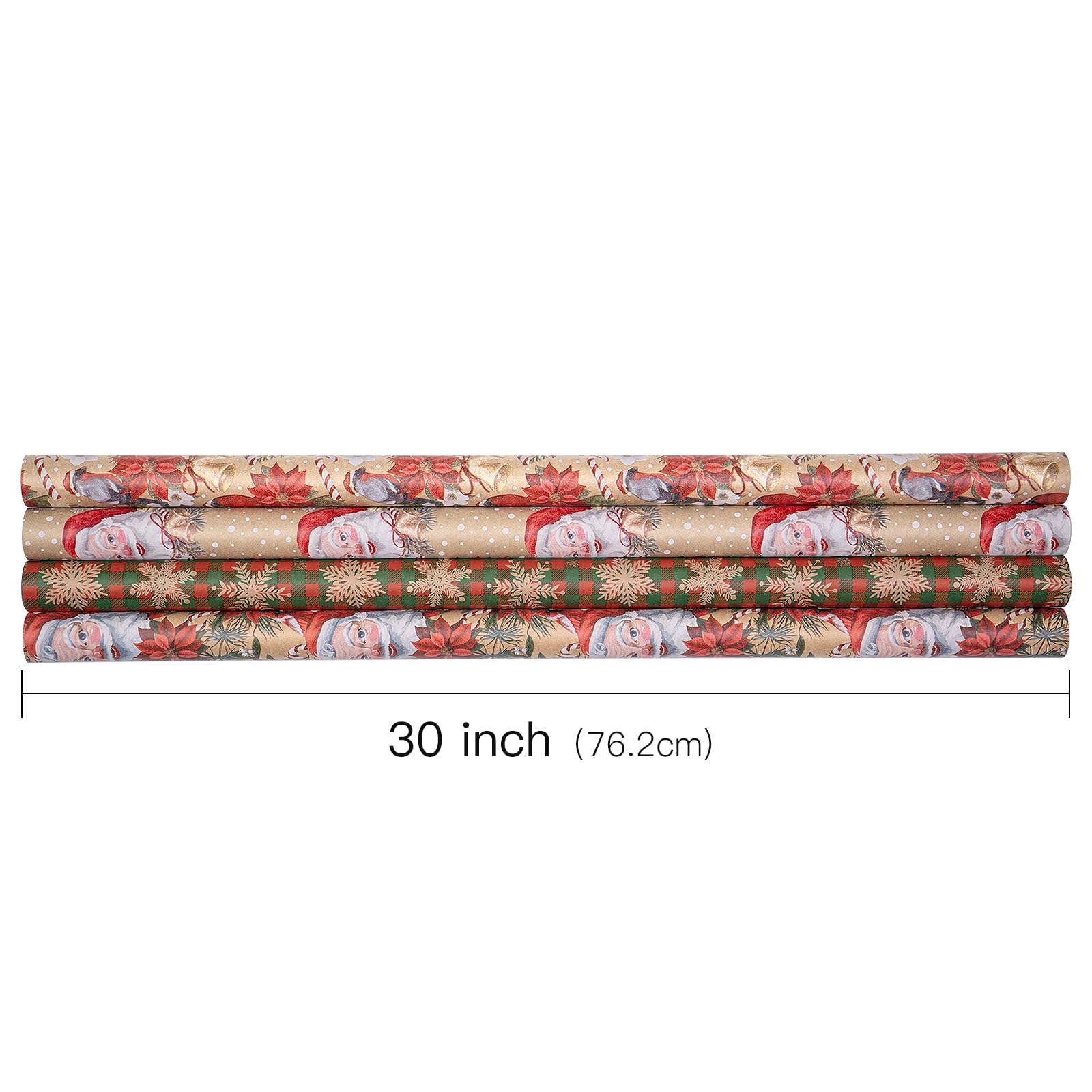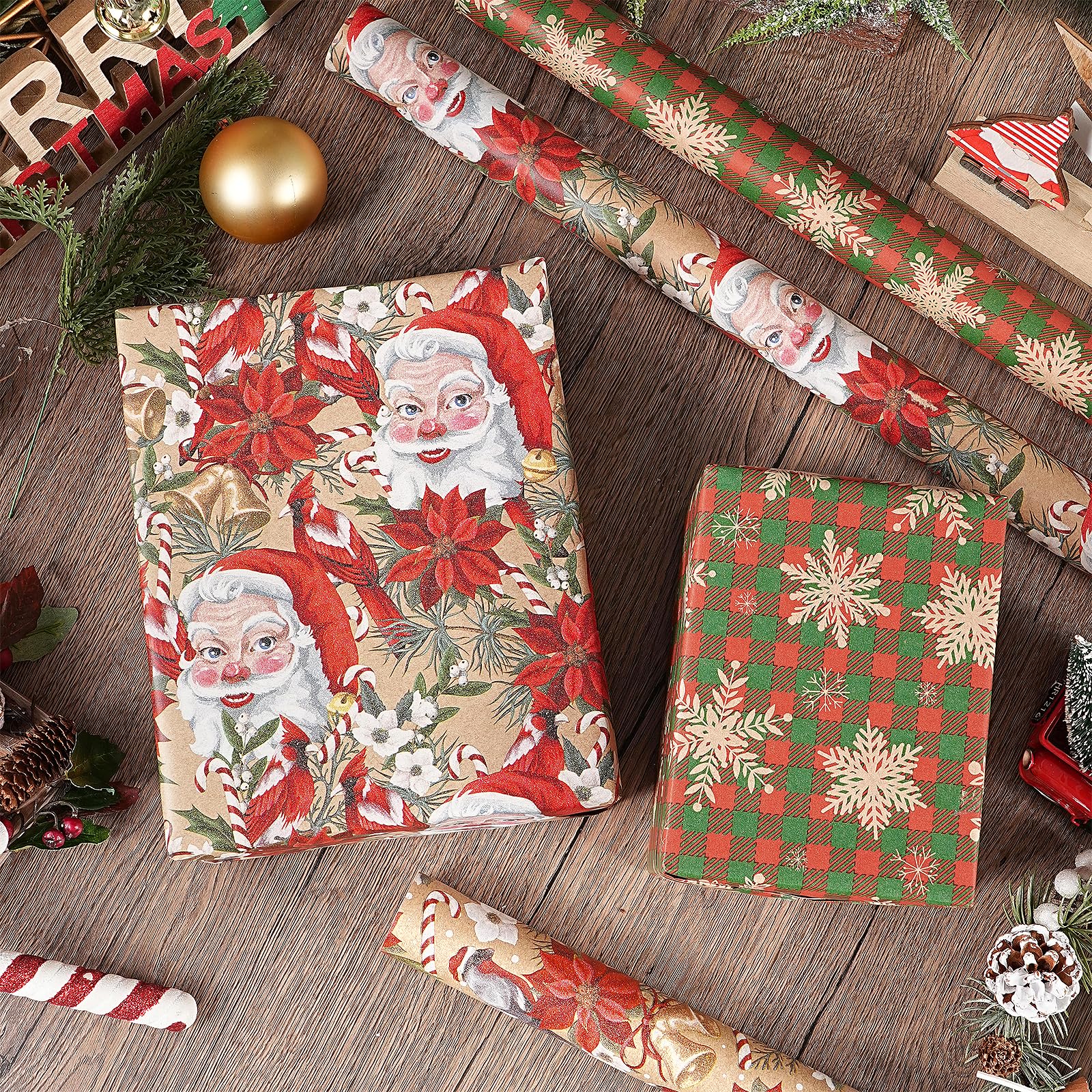Kraft Christmas Wrapping Paper Set, Jumbo Roll, Vintage Santa, Bird, Poinsettia,and Gold Snowflake Plaid Design, Kraft Gift Wrap for Christmas, Holiday, 4 Rolls, 30 Inches x 10 Feet per Roll