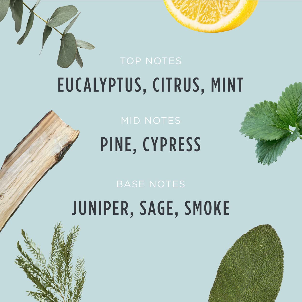 - Top Notes: Eucalyptus, Citrus, Mint / Mid Notes: Pine, Cypress / Base Notes: Juniper, Sage, Smoke