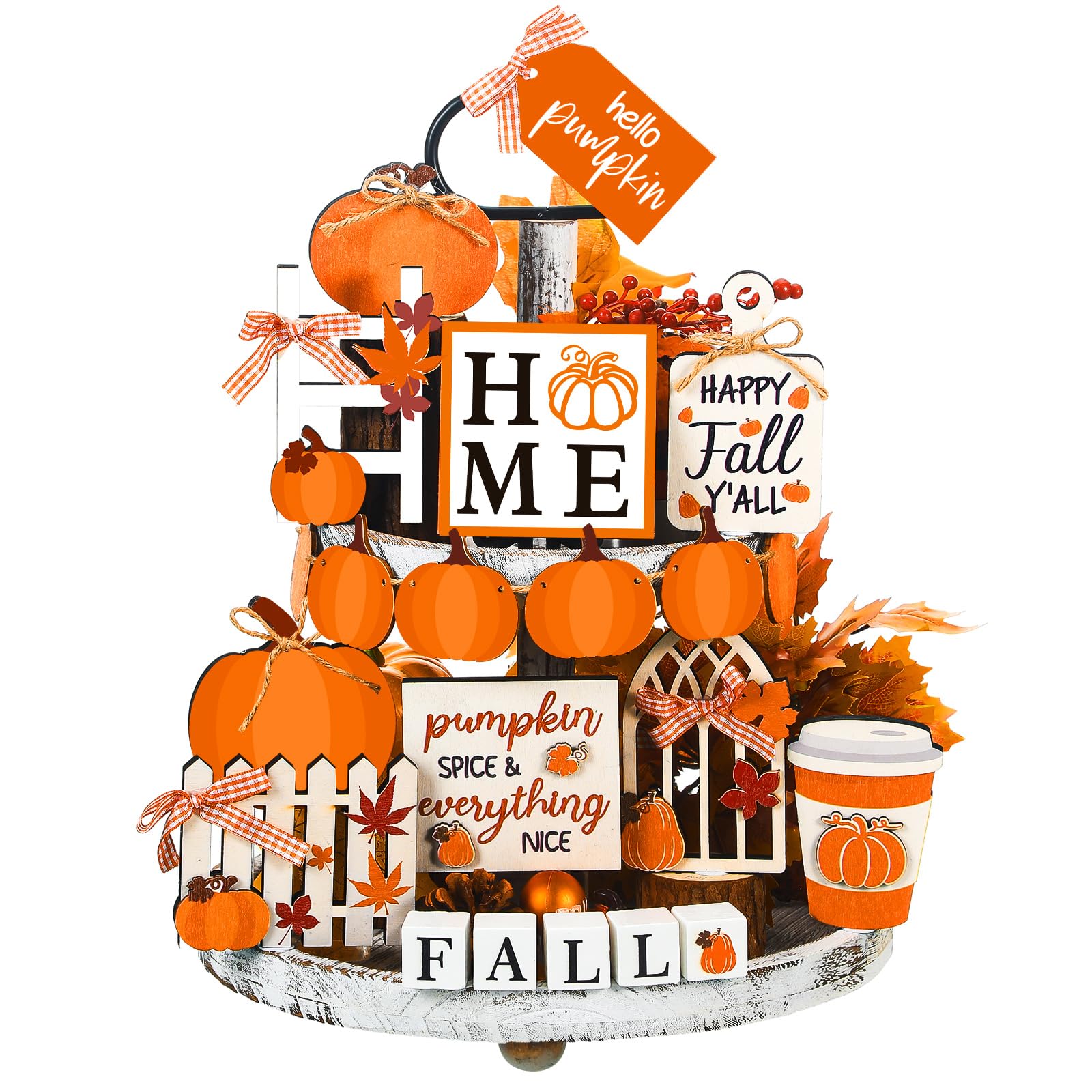 - Fall Tiered Tray Decorations Set: you will receive 13 pieces of fall tiered tray decorations, including pumpkin and maple leaf shaped decorations that can be strung on the rope provided to form a banner, and there are some adhesive dots, sufficient quantity can meet your home or party tiered tray decor needs, and you can share with others