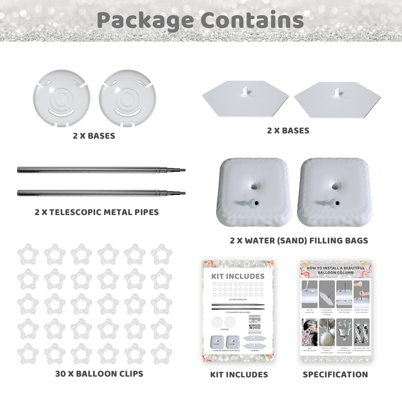 Details: Balloon arch stand Balloon arch kit Balloon stand What You Will Get The balloon stand kit package includes 2 Telescopic Metal pipes, 2 PVC bases, 2 water bags, 30 balloon clips, and 2 balloon cups, 1 manual.