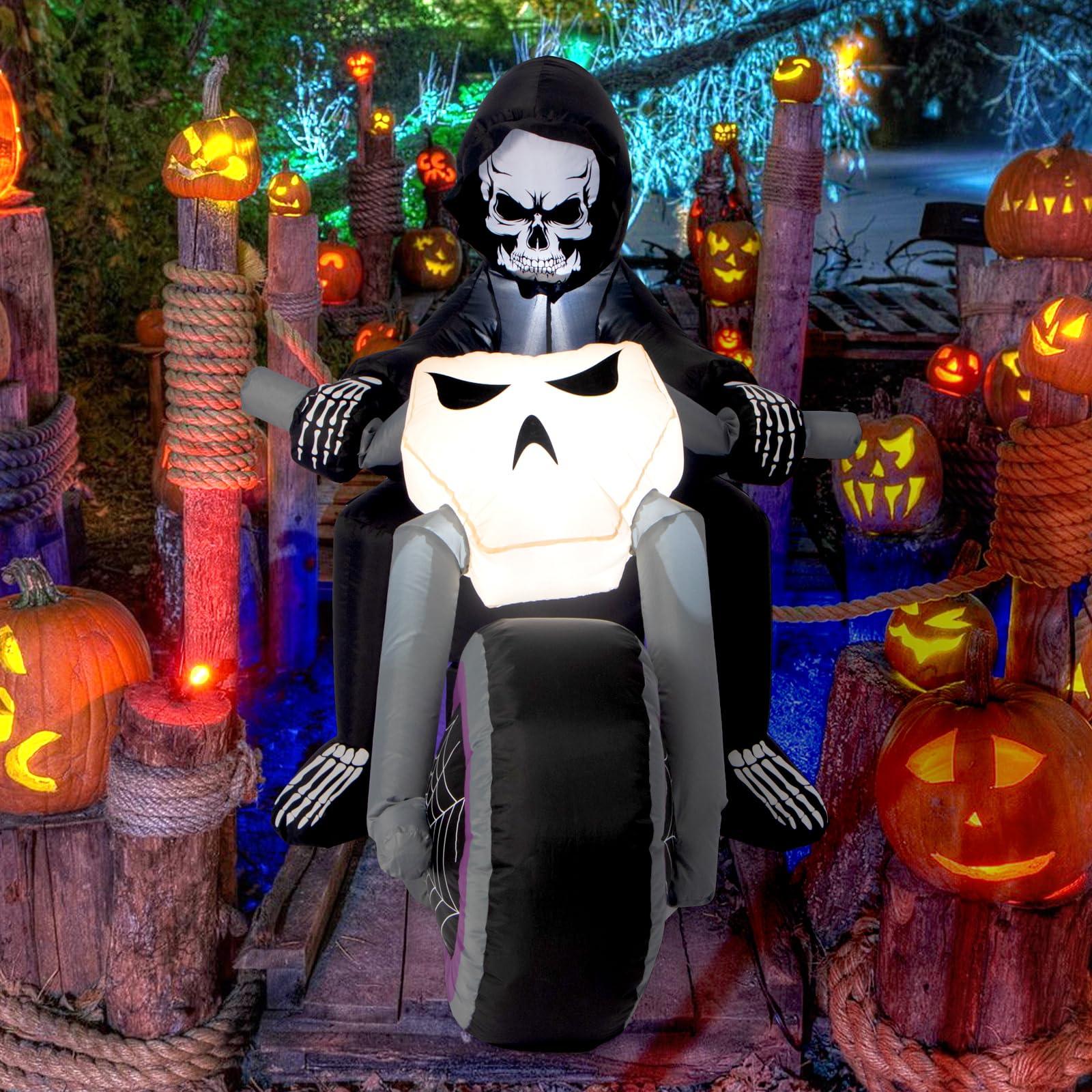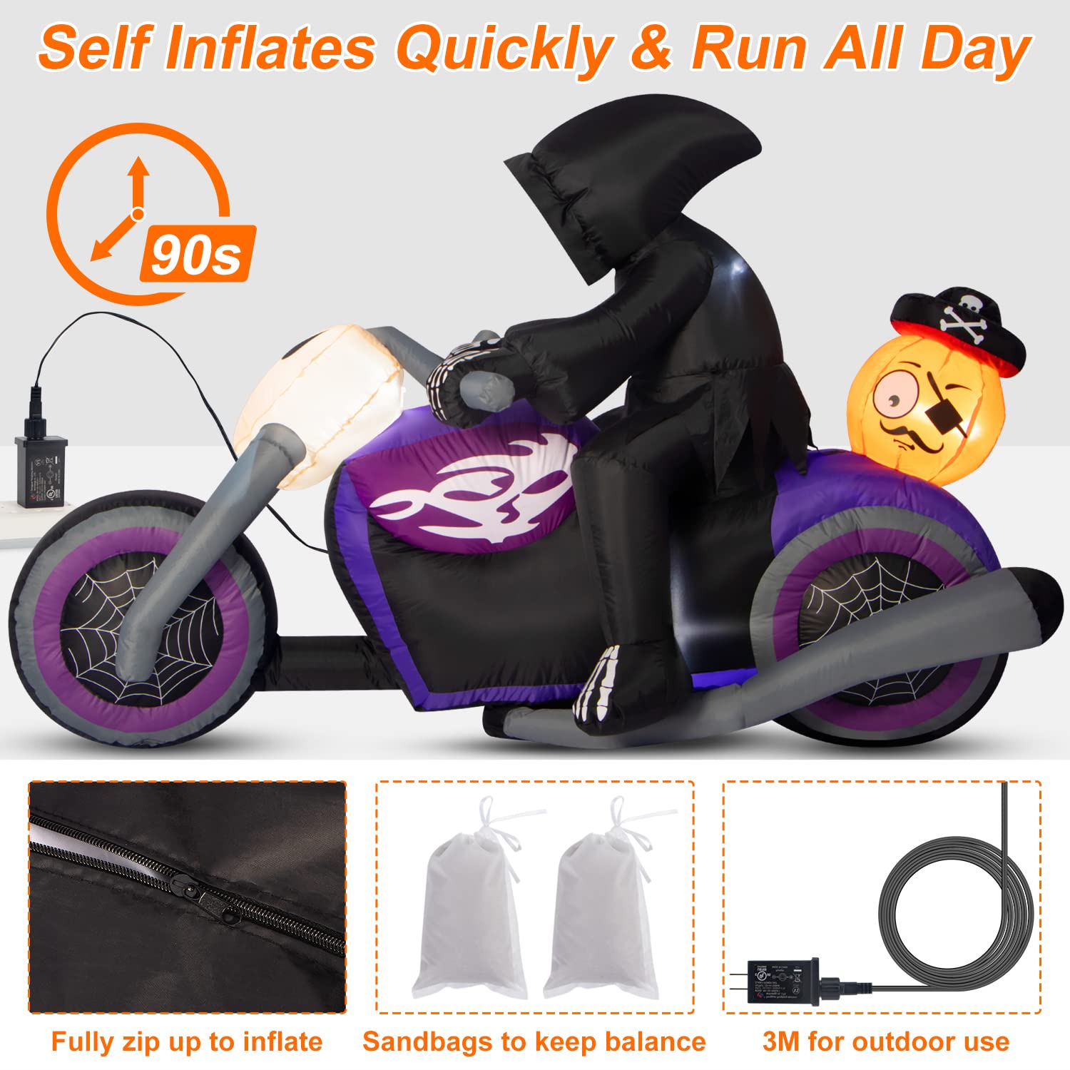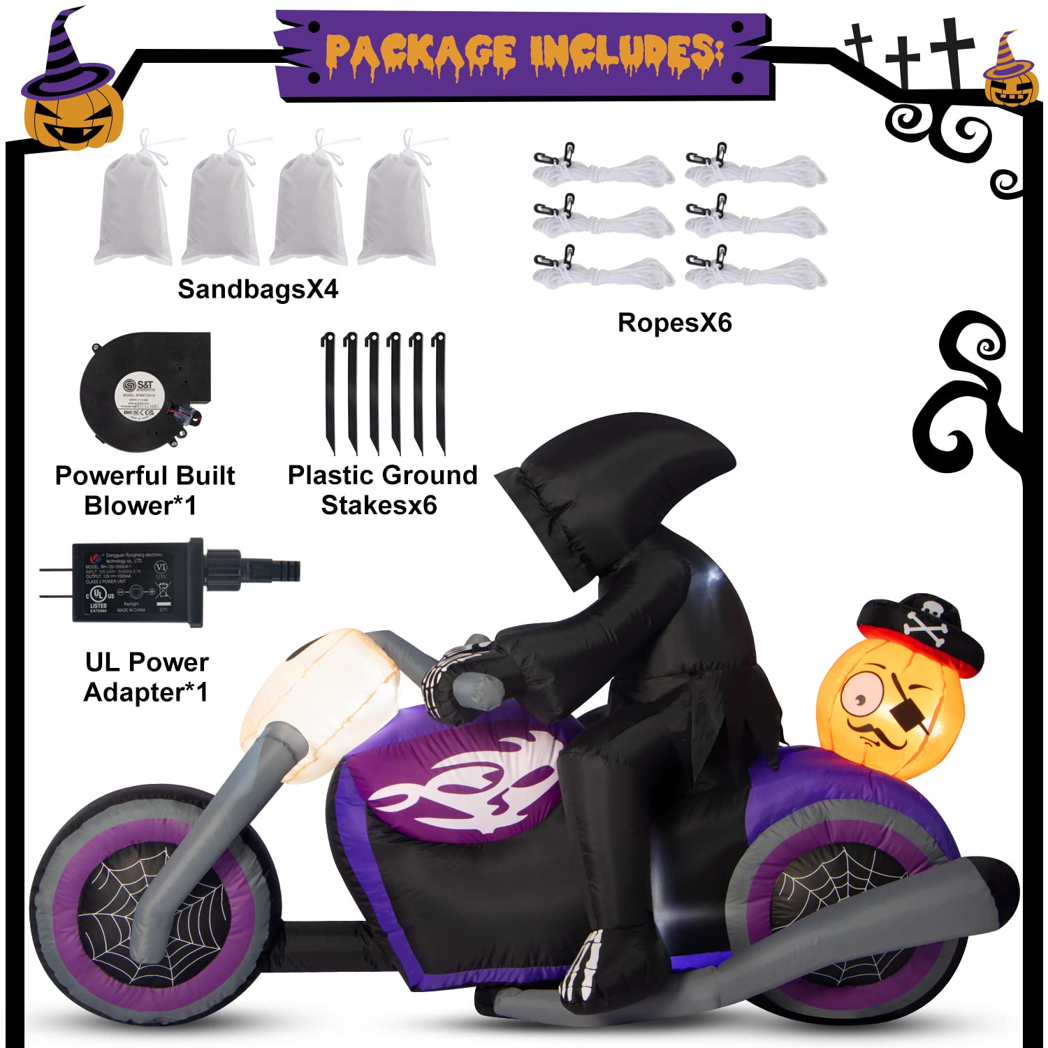 - 【Great for Festival】This 6FT inflatables rider pumpkin with Built-in LED Lights creates a creepy yet friendly scene on your front lawn or walkway. Kids and parents alike love to take photos with Halloween blow ups,which would give your guests and your family a fright and a delight.