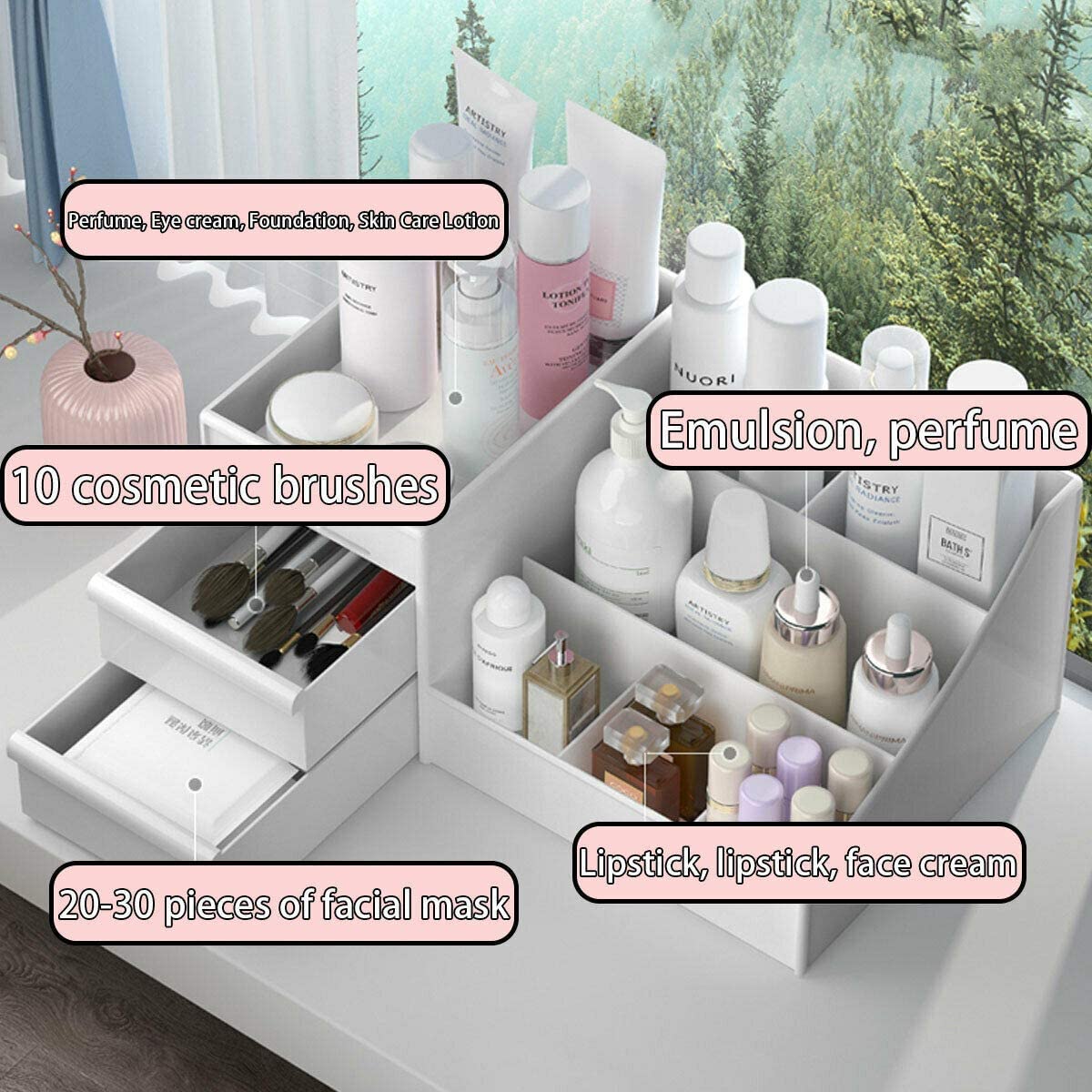 skin care organizer,Makeup Desk Organizer With Drawers,Countertop Organizer for Cosmetics,Vanity brush with Holder for Lipstick, Brushes, Eyeshadow, and Jewelry Desktop Finishing Dresser (White)