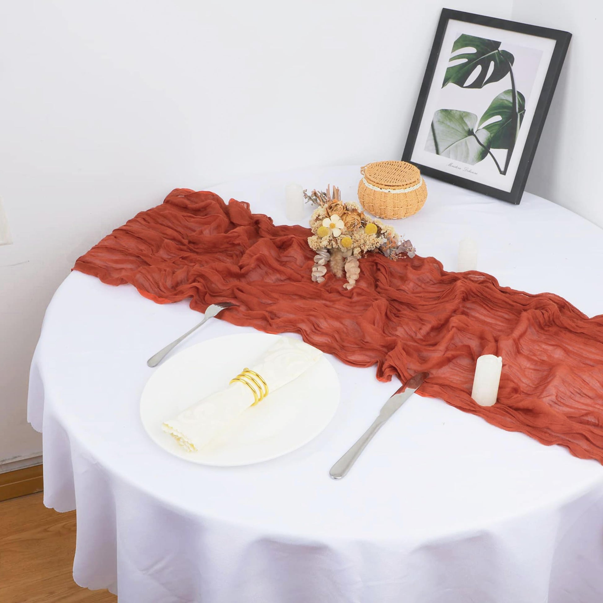 - PREMIUM MATERIAL: This rust cheese clothes table runner with wrinkled texture is made from soft premium cheesecloth gauze fabric. Available in 10 colors, terracotta table runner allow you to combine your wedding colors in interesting, artistic and unexpected ways. Place flower centerpieces and candles on top of the gauze table runner as a decorative touch. Enjoy a beautiful romantic rustic boho style