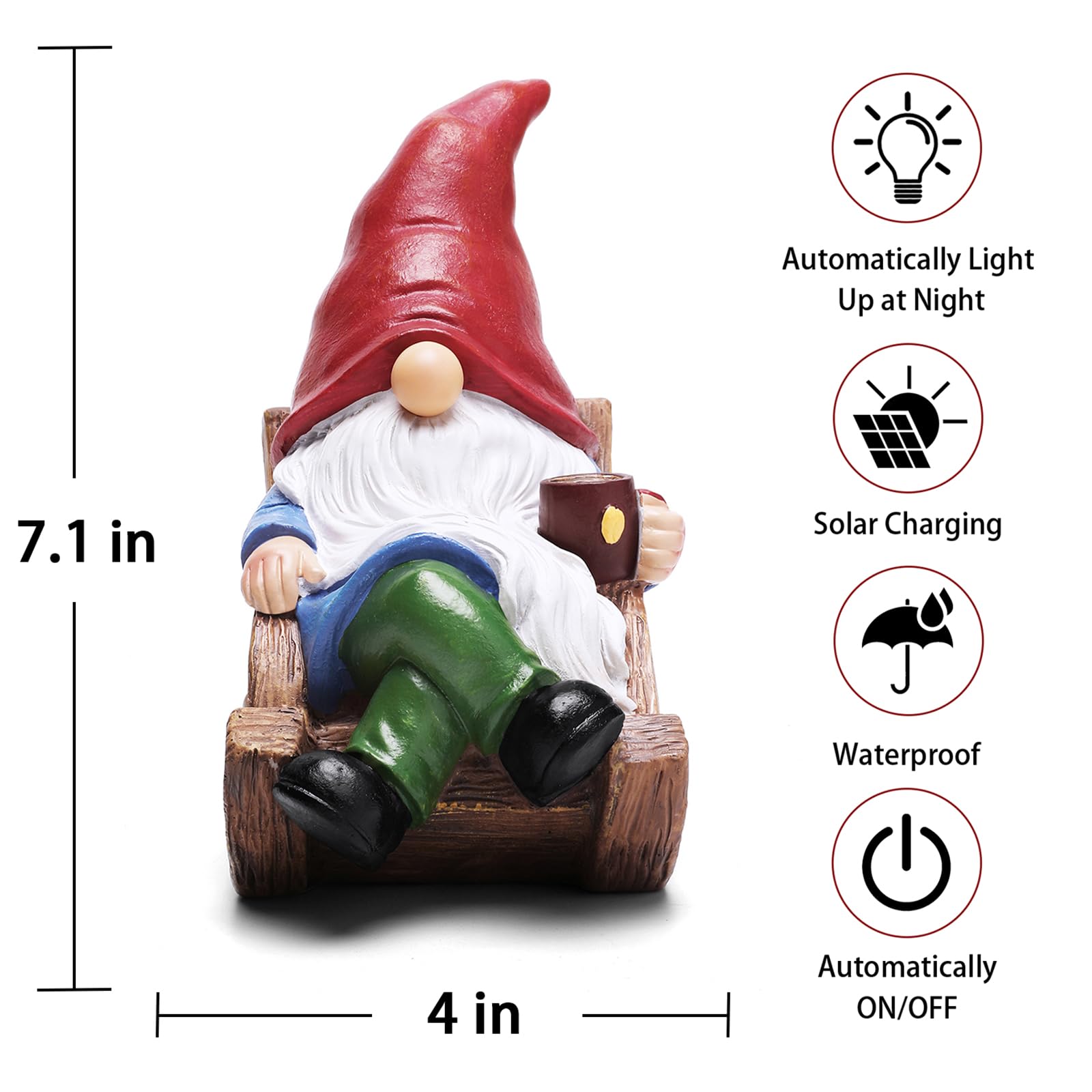 - 【Charming Design】This Rocking Chair Gnome Solar Light combines the charm of a gnome, the coffee cup and the gnome's nose will glow, and the functionality of a solar light. Its unique design is sure to catch the eye and add a touch of whimsy to your outdoor decor.