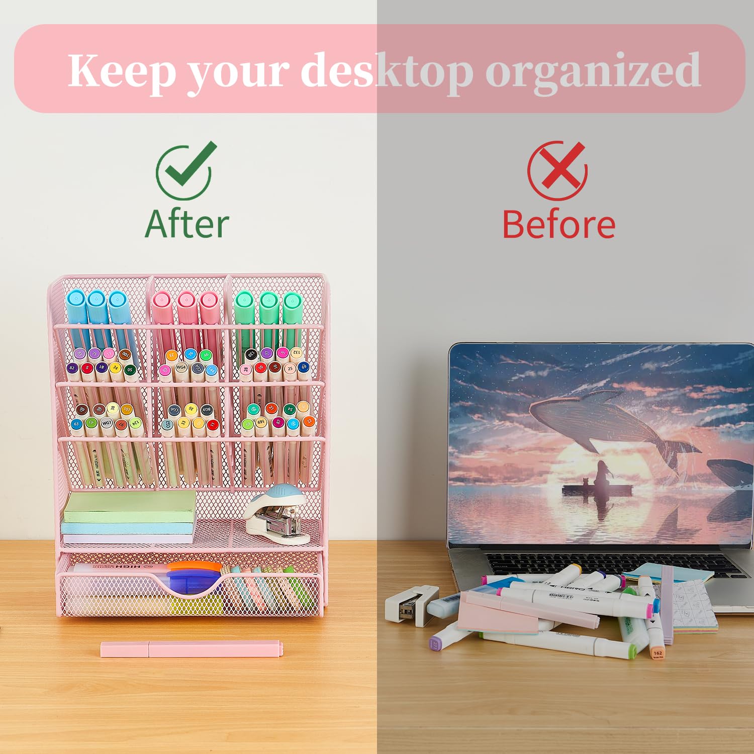 Spacrea Pen Holder Desk Organizer - Desk Organizers and Accessories, Pencil Holder with 10 Compartments and 1 Drawer(Pink)