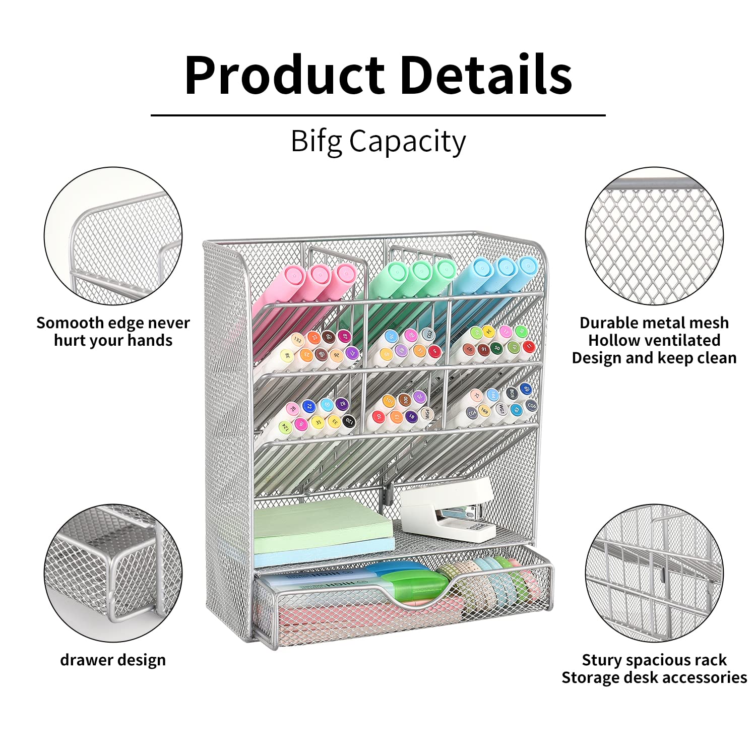 Spacrea Pen Holder Desk Organizer - Desk Organizers and Accessories, Pencil Holder with 10 Compartments and 1 Drawer (Silver)