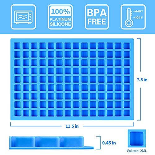 Details: Start your homemade candy with these silicone molds, it's great for gummies, little chocolate, ice cubes, hard candy. Each mold: 126-Cavity Package Including: 2pcs x silicone molds, size: 11.5"x7.5" Each cavity: 2ml., 0.6"x0.6"x0.4" Due to flexible, please make sure to use a cookie sheet or metal tray underneath silicone mold to support, for easy to take in or out of fridge.