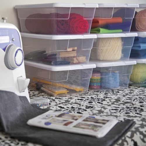 Sterilite 6 Qt Storage Box, Stackable Bin with Lid, Plastic Container to Organize Shoes and Crafts on Closet Shelves, Clear with White Lid, 12-pack