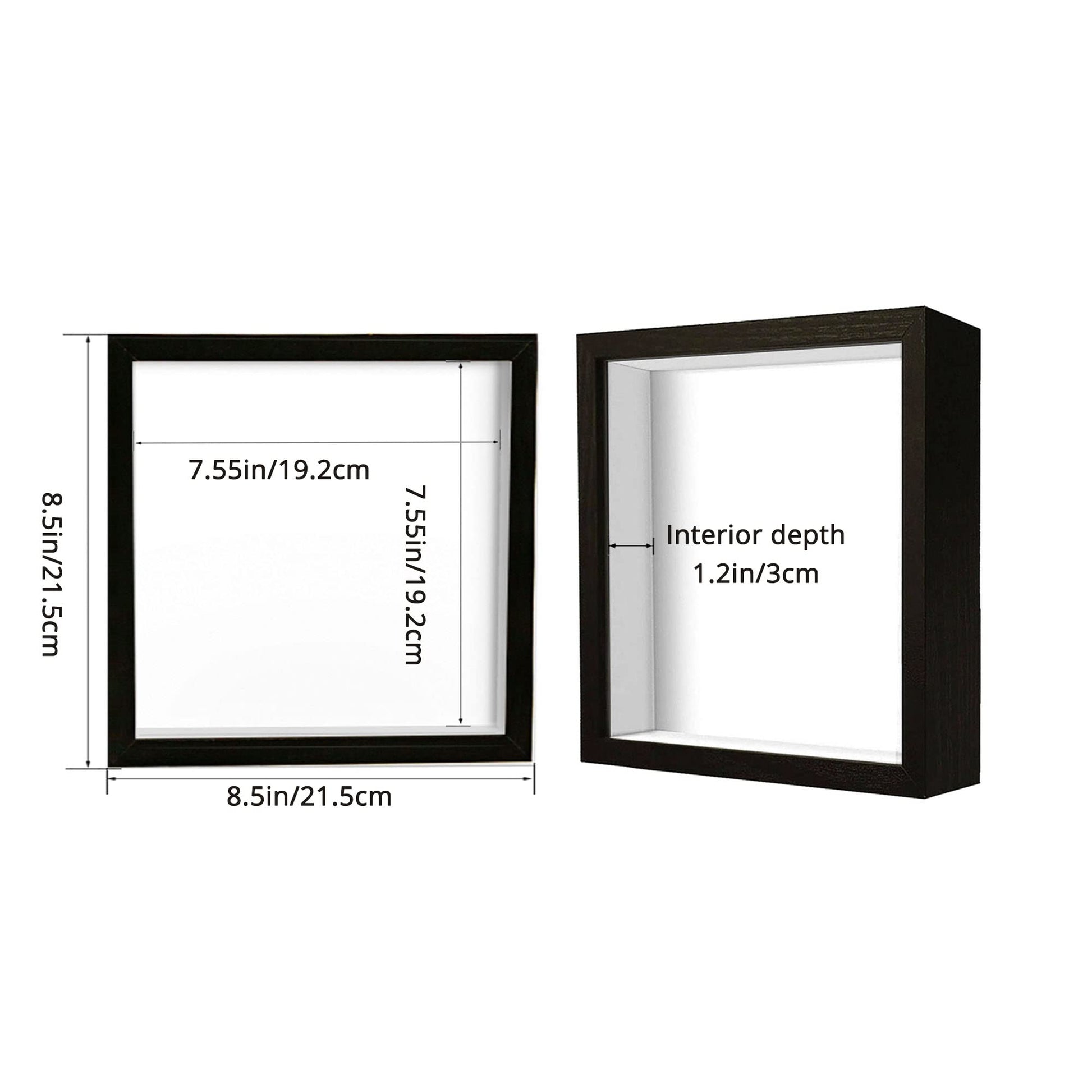 - Size: The exterior dimensions of this 8x8 shadow box are 8.5x8.5 inches with an exterior depth of 1.8 inches. And the internal dispaly size is 7.55x7.55 inches with an interior depth of 1.2 inches.