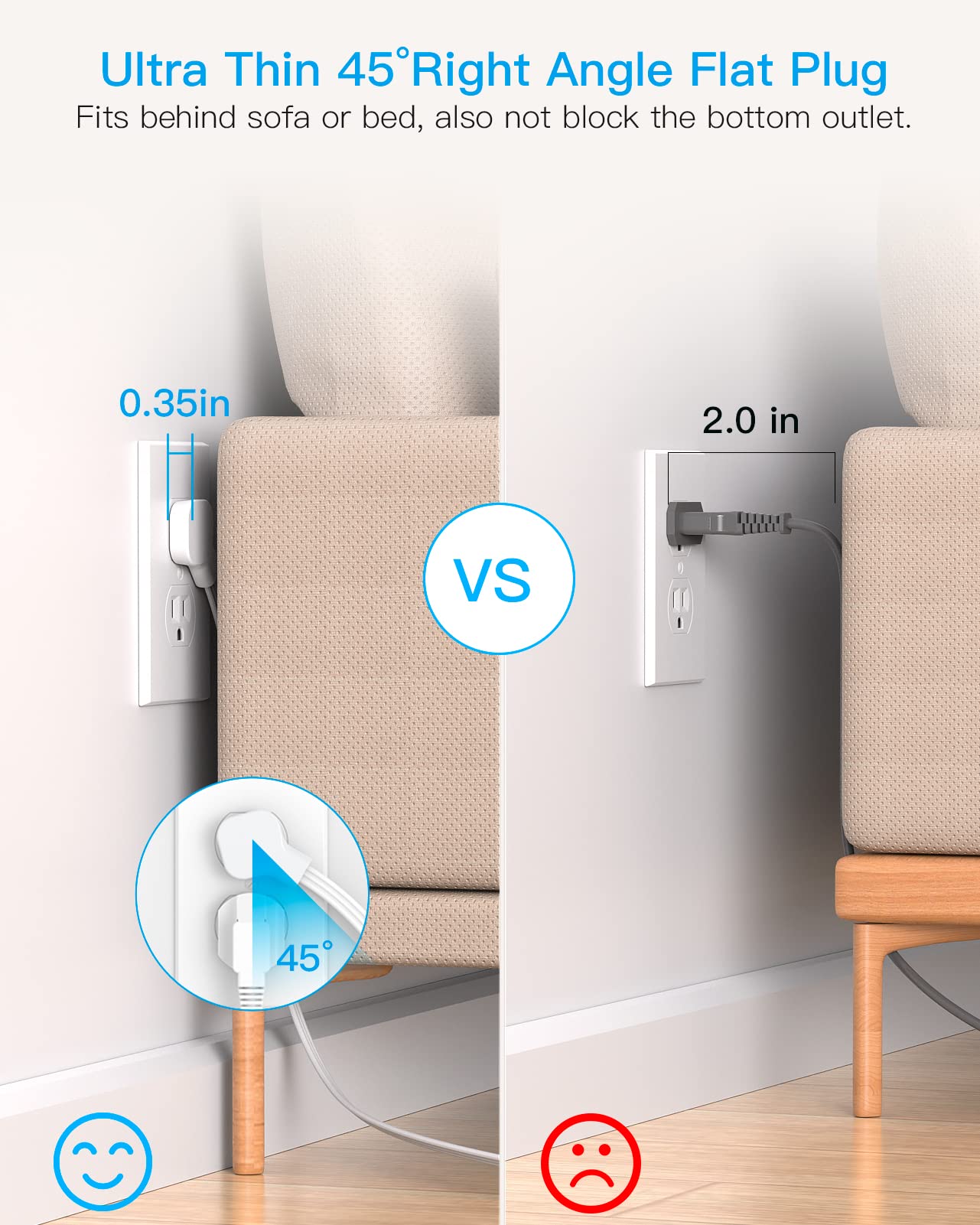 - 【Ultra Slim Flat Plug Power Strip】With only 0.35 inch ultra thin plug and 45° right angle design, which can close to the wall easily, and hide in the back of furniture, bed or refrigerator.