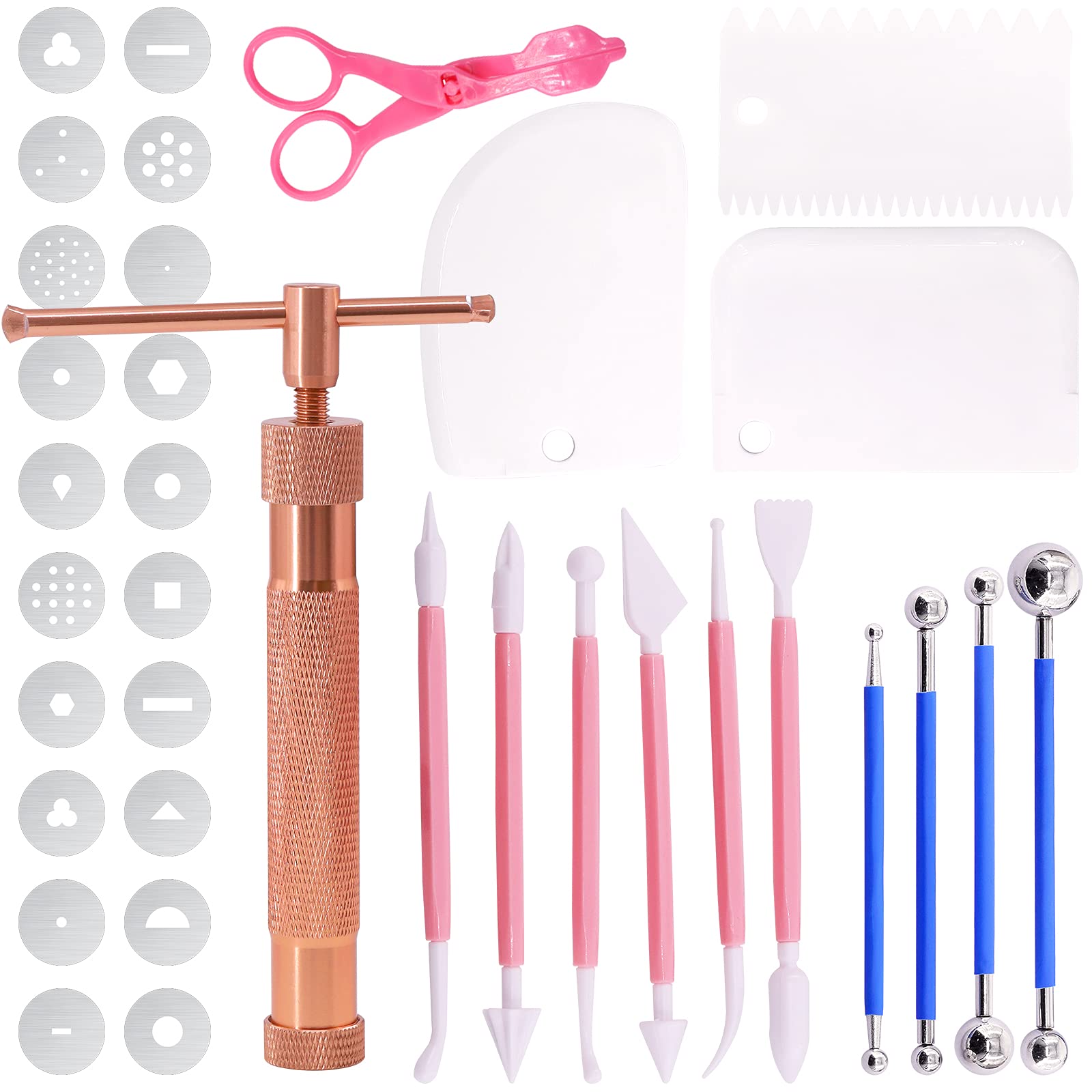 - ❤ What You Get ----- In this kit, You will get 36Pcs Modeling Tool Kit, Including 1Pcs Rose Gold Clay Extruder Gun with 20Pcs Extrusion Discs, 4Pcs Ball Stylus Dotting Tool, 8Pcs Plastic Crafts Clay Modeling Tool, 1Pcs Scissor with 3Pcs Plastic Scraper perfect for Cake Decorating Supplies Modeling Tool.