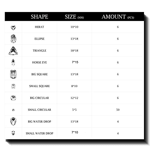 - QUANTITY&SHAPE:Every package includes 100 pcs rhinestones in sewing on setting.6×small square,6×big square,6×ellipse,6×heart,6×triangle,6×horse eye,6× big circular,4×small water drop,4×big water drop,50×small circular.