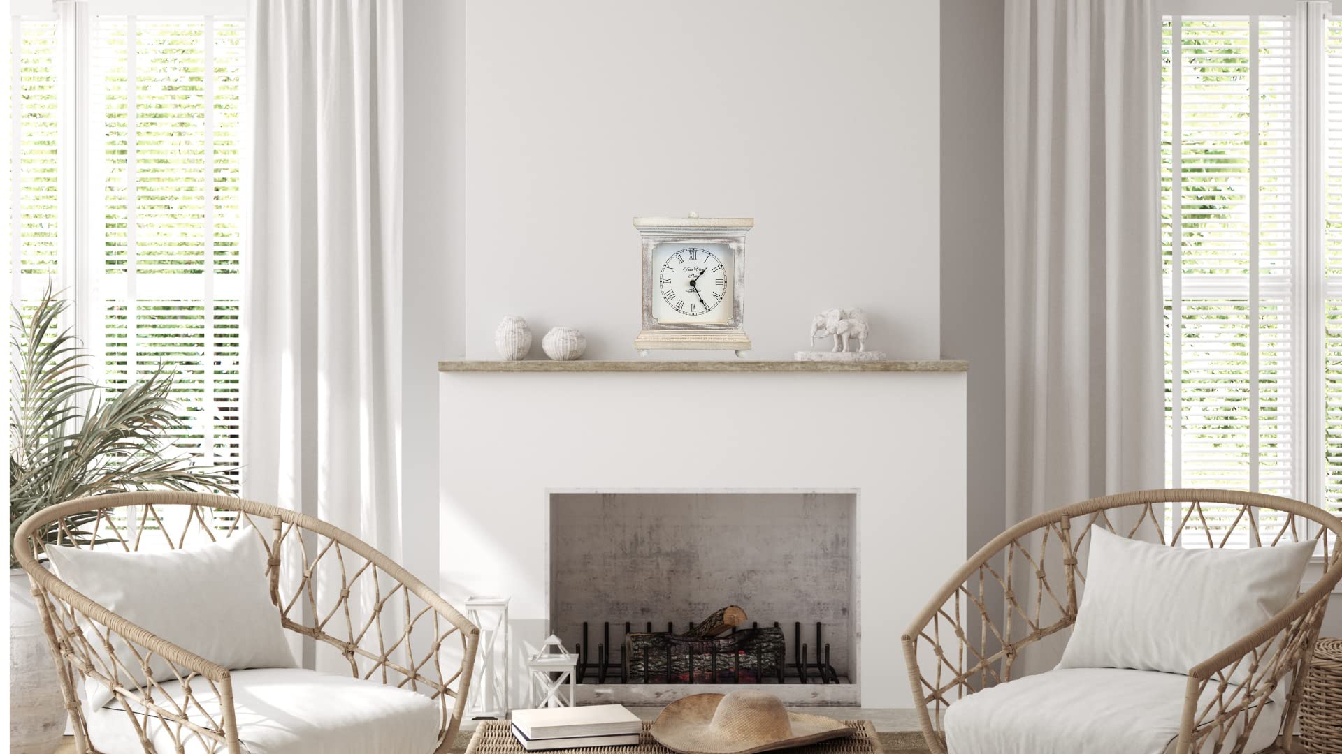 Tasse Verre Rustic Shelf Clock (Quiet) for Living Room Mantel, Table, Or Desk 9" X 7" Farmhouse Decor Distressed White Washed Wood Silent - Office Fireplace. AA Battery Operated Non-Digital, Tan