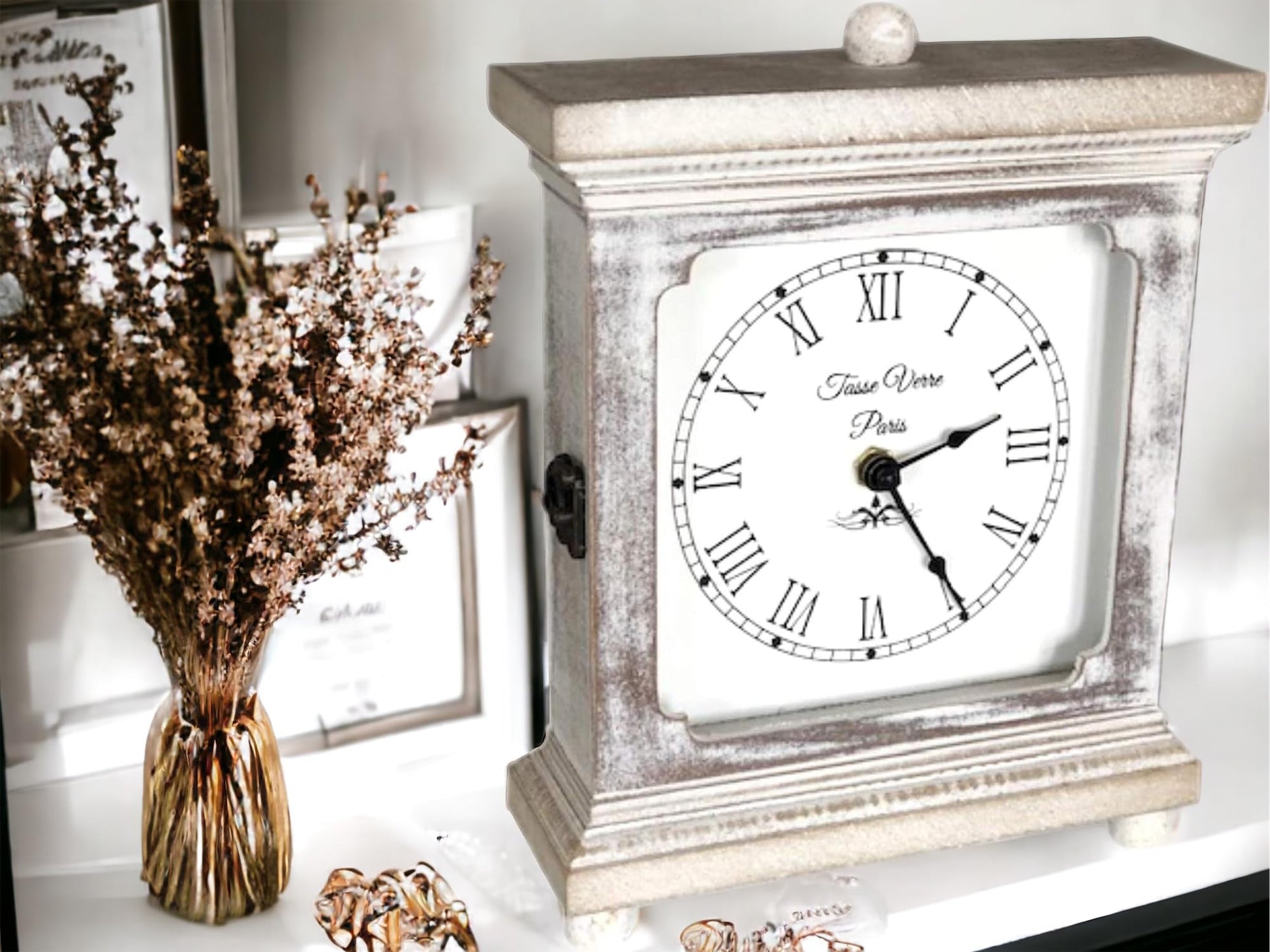 - ADD A TOUCH OF CLASS TO YOUR HOME OR OFFICE: This beautiful, silent shelf clock features a clock face with black Roman numerals and is perfect for any home decor style. This unique clock measures 9 inches x 7 inches and is the perfect size for any kitchen, living room, office, or bedroom. The front door on the clock does not have glass so there is no annoying glare.
