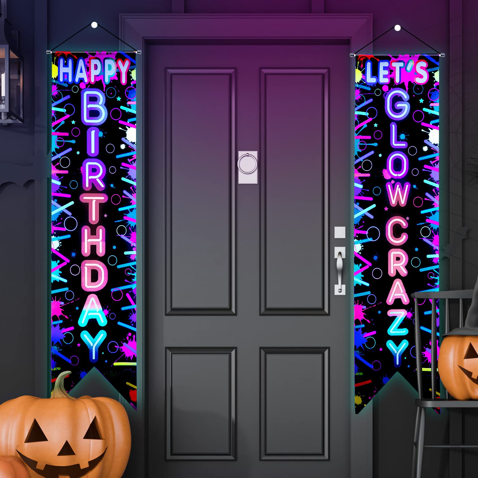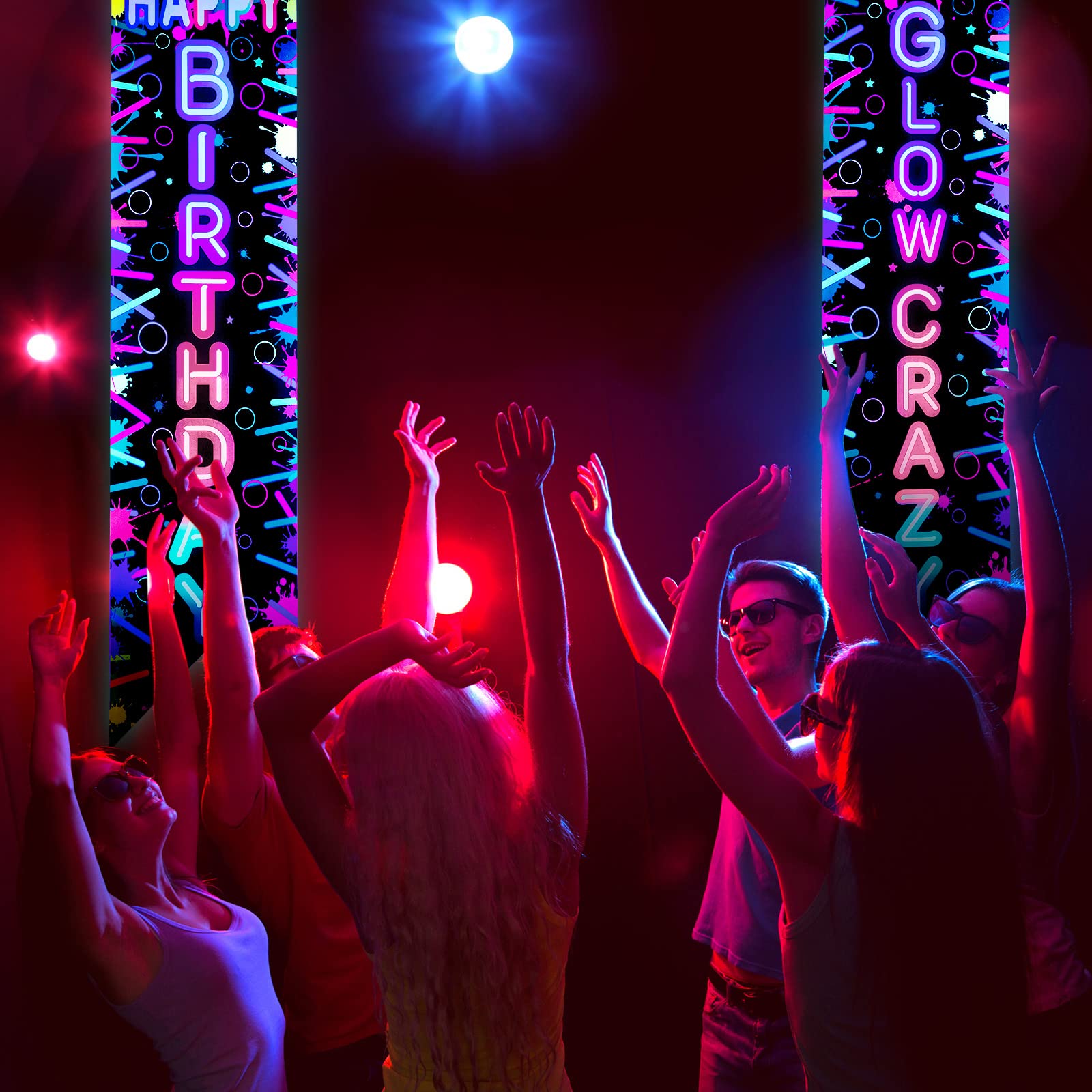 Tegeme Glow in the Dark Party Supplies Neon Happy Birthday Banner Crazy Porch Sign Glow Party Backdrop for Black Light Neon Themed Birthday Party Decorations