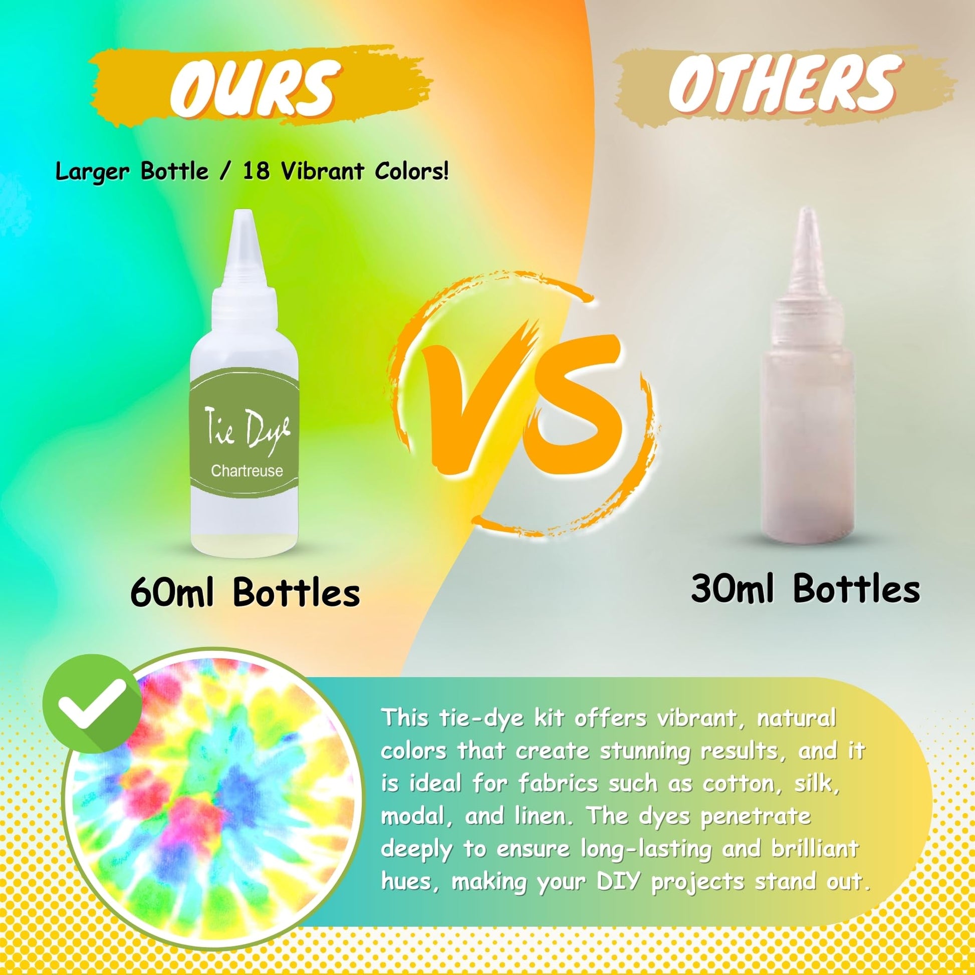 - FUN FOR EVERYONE: Our tie dye set kit is designed for all skill levels. Transform plain t-shirts, socks, bandanas, or any cotton-based fabric into vibrant, wearable art. It's a fantastic group activity for parties or a relaxing weekend afternoon. You will receive 1 Box of Tie Dye Kit Set with 18 Colors.