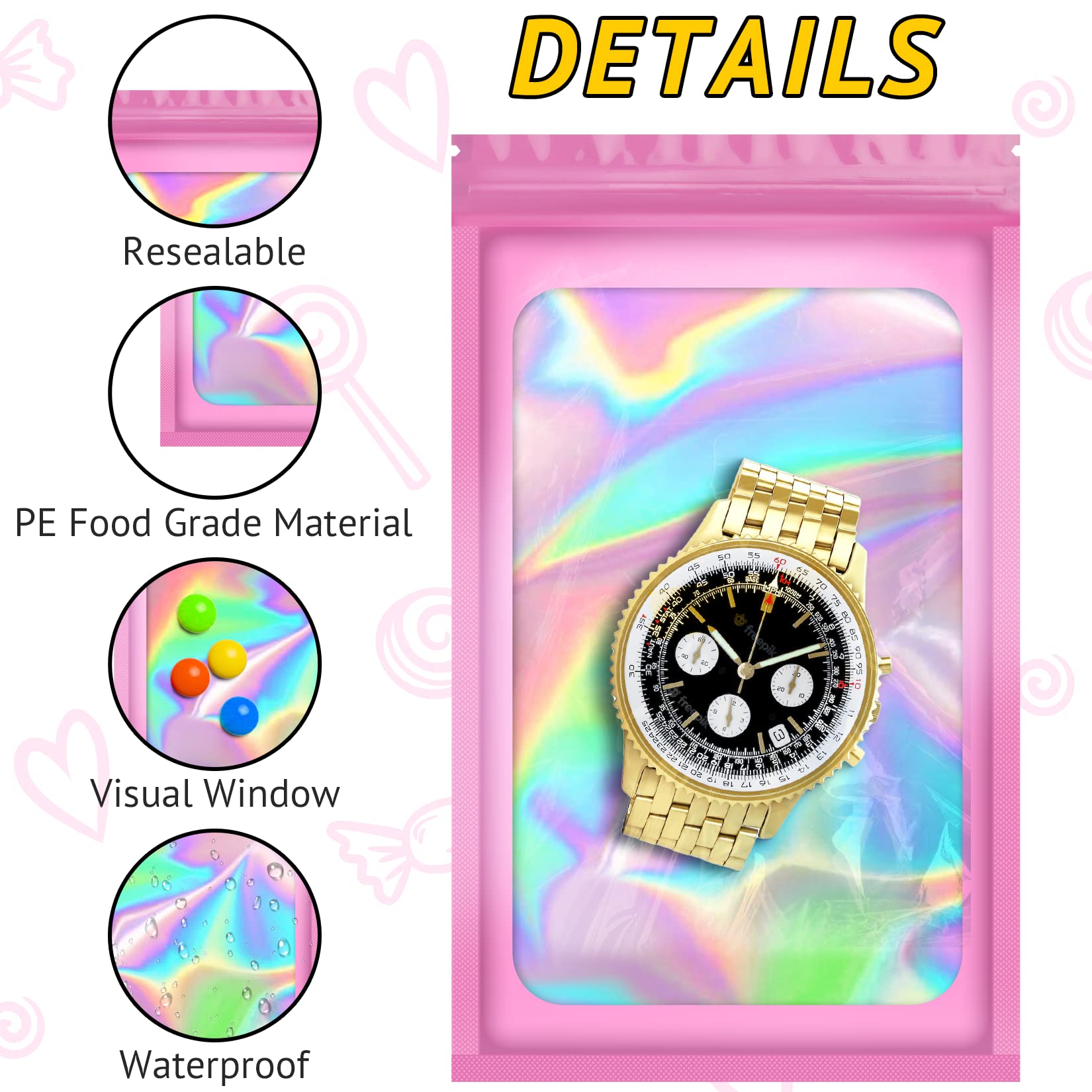 TIFICAL 100 PCS Smell Proof Bag, Packaging Bags, Holographic Mylar Bags, Foil Resealable Bags for Small Business Candy Jewelry Bracelet Party Favor Food Storage Sample Supplies (2.4×3.9 Inch, Pink)