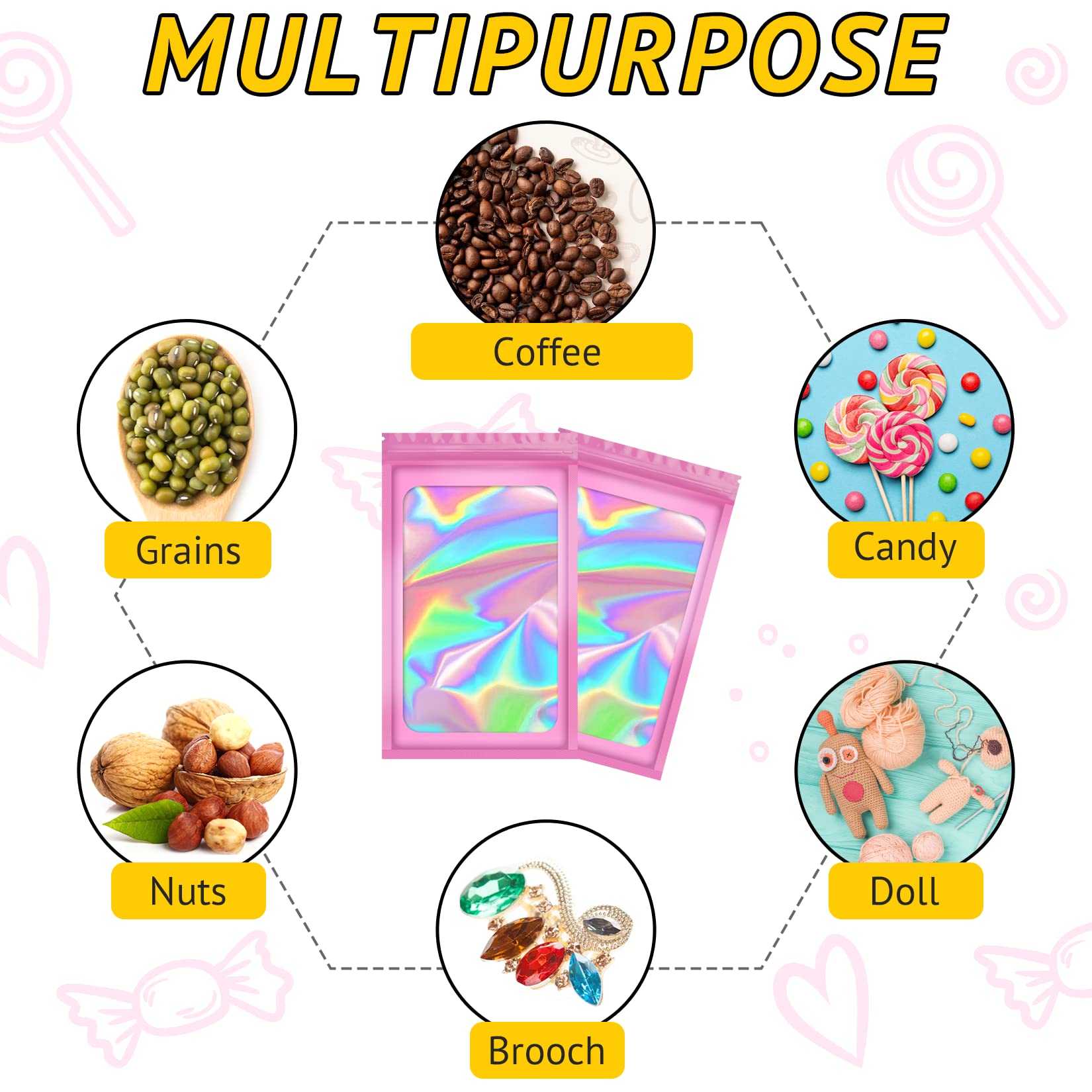 - Multipurpose: The resealable bags for small business can be used to store whole grains, tea, coffee, dried seafood, candy, snacks, nuts, stationery, jewelry, hair accessories, makeup brush tools, electronic product parts. The transparent window on the front of the bag clearly displays the items. These delicate bags are also perfect for wrapping gifts as gift bags for your friends, family, colleagues, clients.