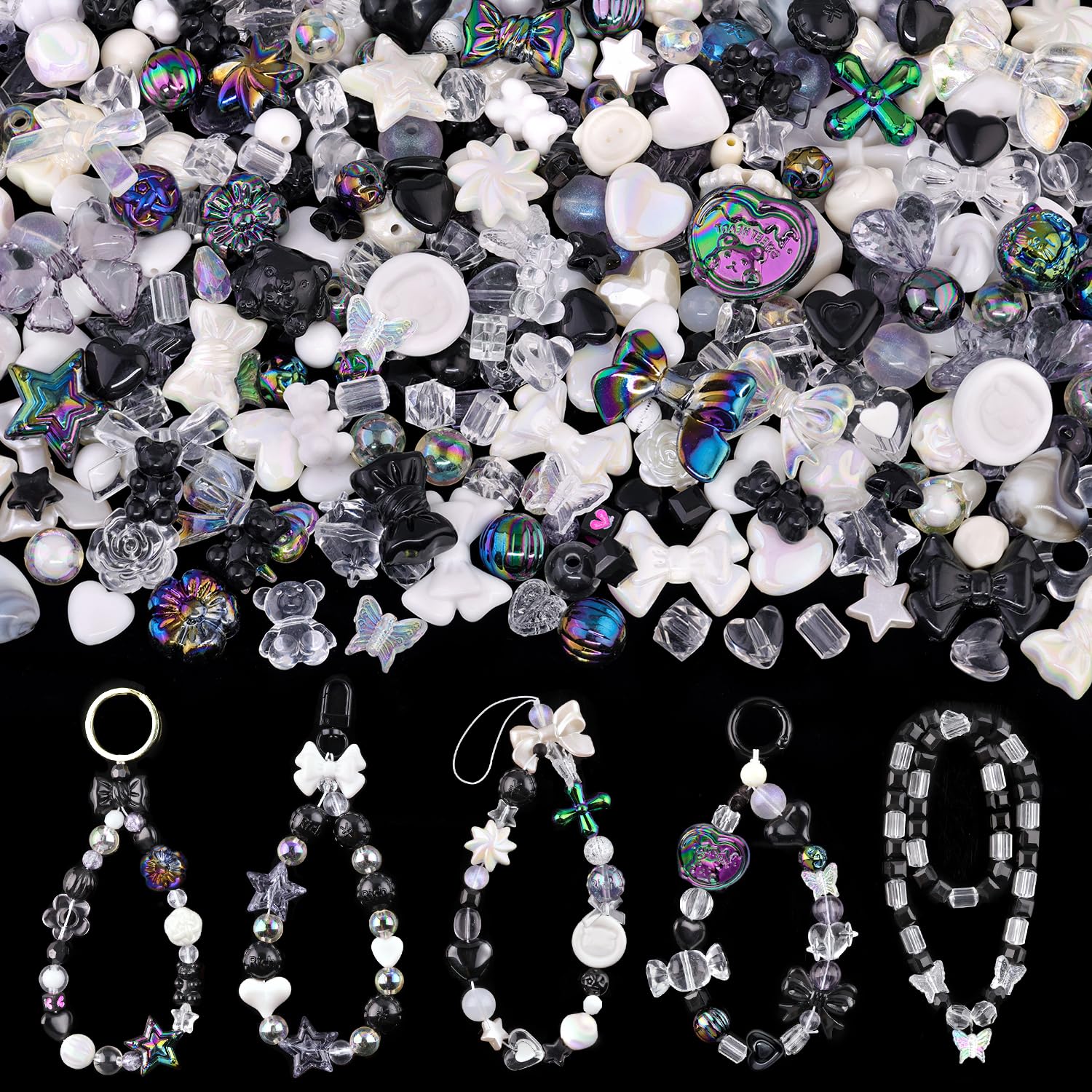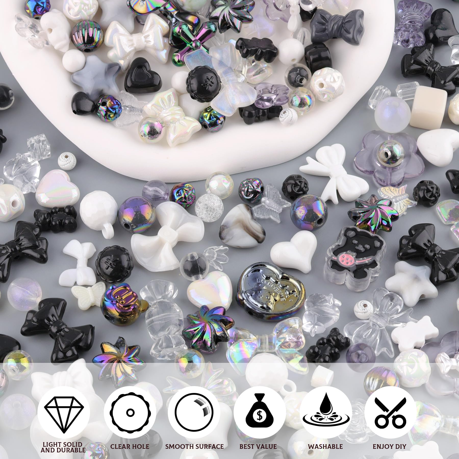 - PACKAGE CONTENT - Includes 150g of black assorted beads (170-230 pcs),enough to fulfill your DIY ideas.This set features transparent, jelly, iridescent, glitter and solid color effects. Along with shapes like hearts,butterflies,bows,gummy bears and more