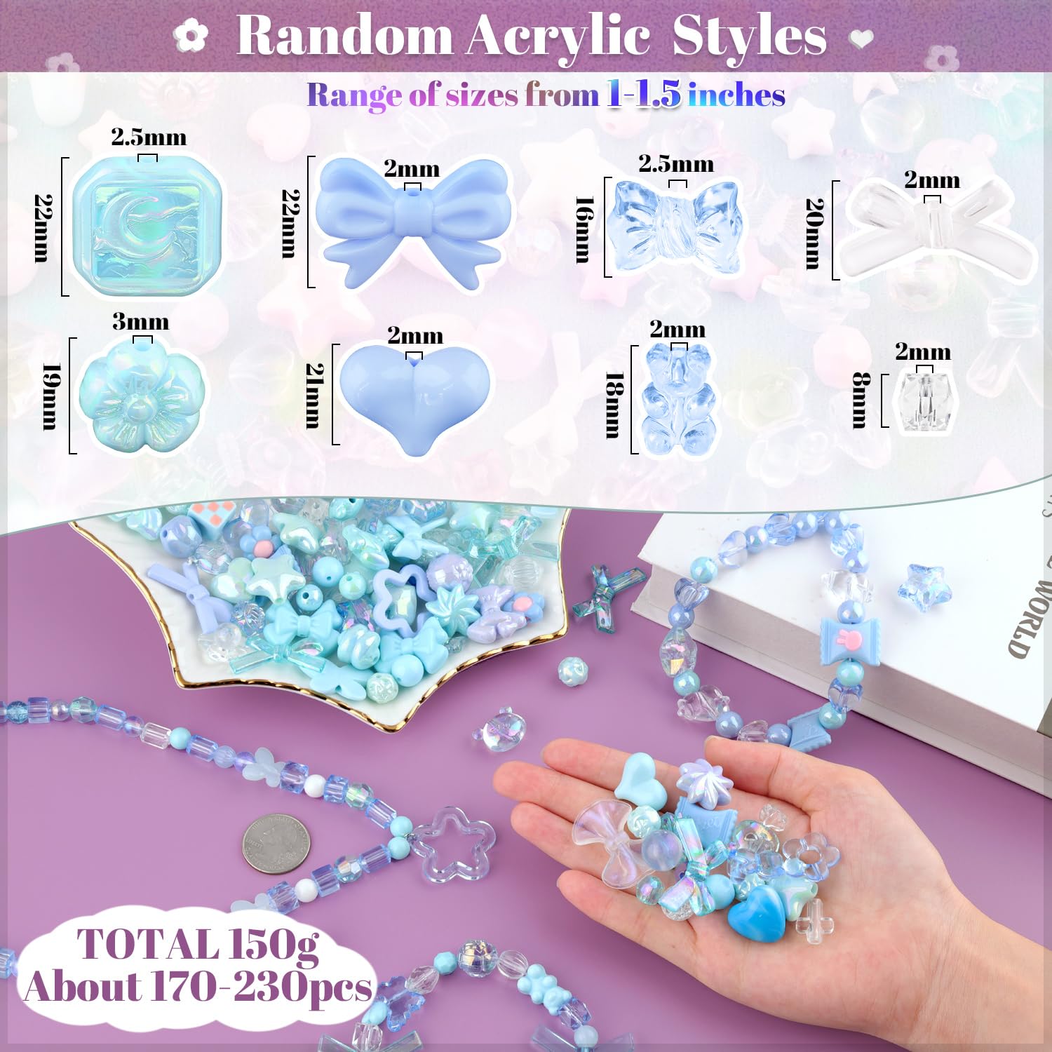- PACKAGE CONTENT - Includes 150g of blue assorted beads (170-230 pcs),enough to fulfill your DIY ideas.This set features transparent, jelly, iridescent, glitter and solid color effects. Along with shapes like hearts,butterflies,bows,gummy bears and more