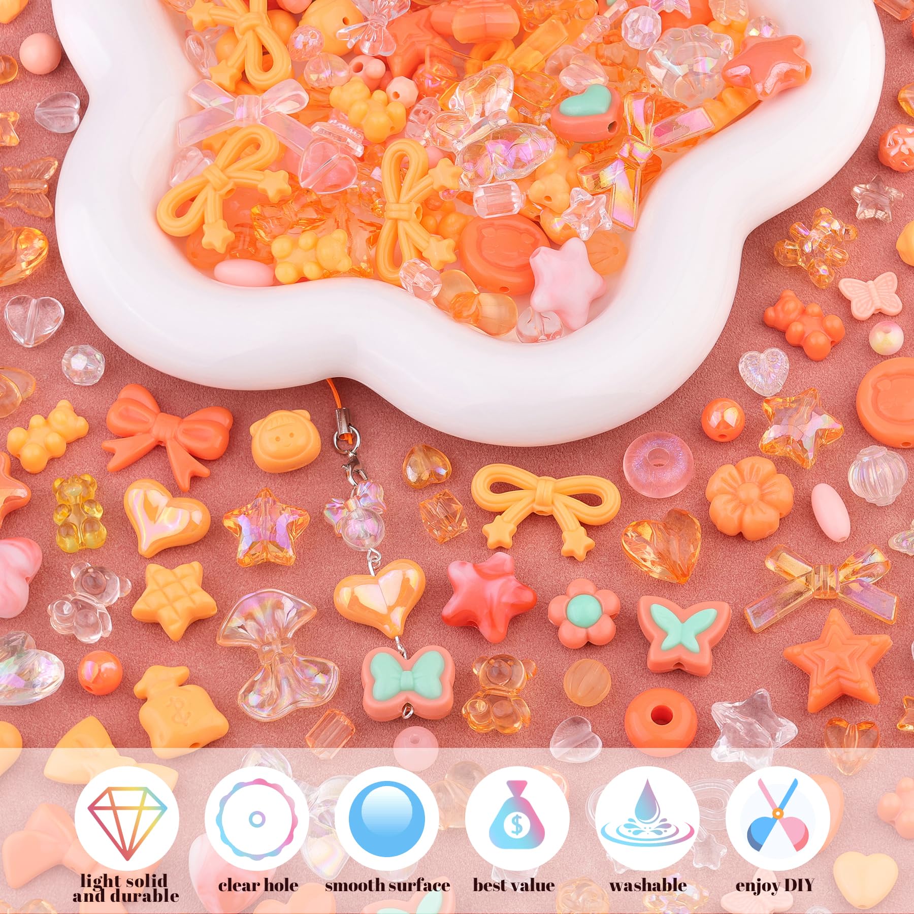 - PACKAGE CONTENT - Includes 150g of orange assorted beads (170-230 pcs),enough to fulfill your DIY ideas.This set features transparent, jelly, iridescent, glitter and solid color effects. Along with shapes like hearts, butterflies, bows,gummybears and more